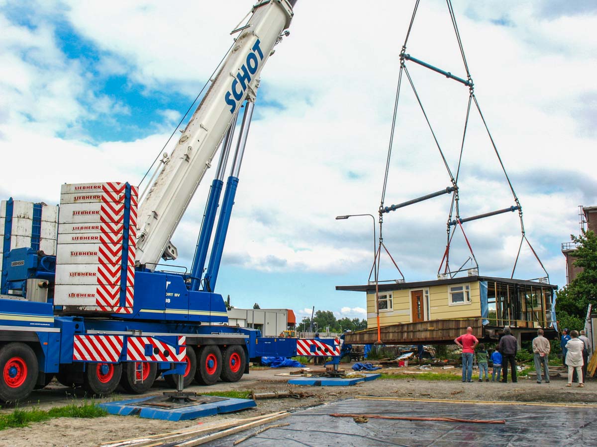 In Amsterdam (NL) musste eine neue Wohnark zu Wasser gelassen werden. Der große Betonkeller, der an Land errichtet worden war, wurde auf ein Gewicht von rund 175 Tonnen geschätzt. Um den Keller ins Wasser zu heben, wurde Schot aus Alkmaar (NL) beauftragt.