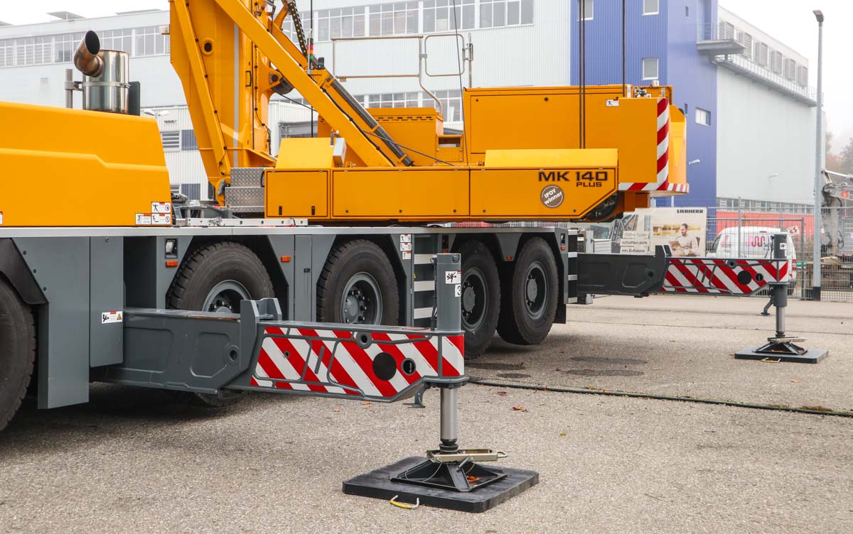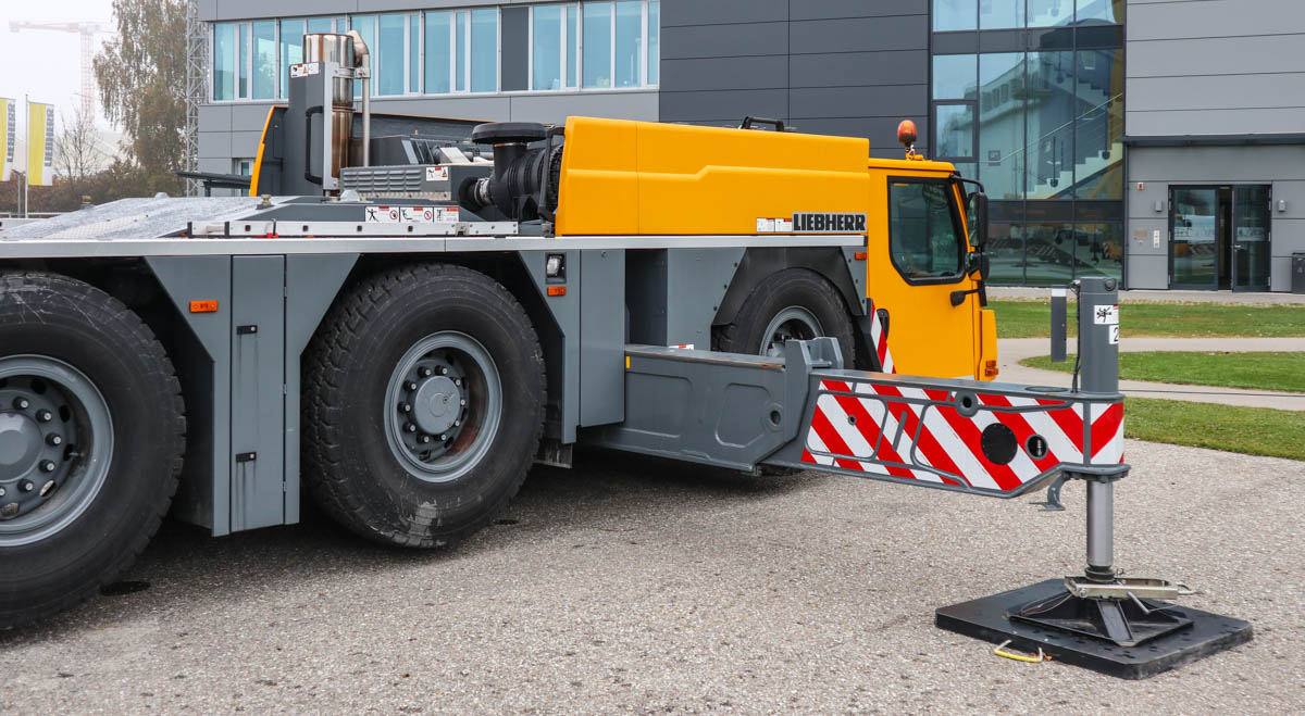 Hier war der Kran mit dem Grundballast von 4,3 Tonnen aufgebaut, dieser hat einen Drehkreis von 3,8 Metern. Der Ballast kann mit weiteren 9 Tonnen Ballast vergrößert werden, der Drehkreis beträgt dann 4,25 Meter.