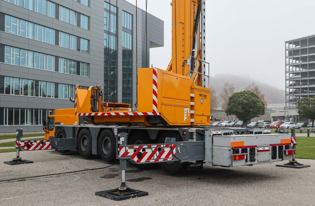 Dieser attraktive Liebherr MK 140 stand im Oktober 2021 auf dem Gelände des Herstellers zu Demonstrationszwecken. Es handelt sich um einen 140-tm-Turmdrehkran, der auf einem 5-achsigen Unterwagen montiert ist.