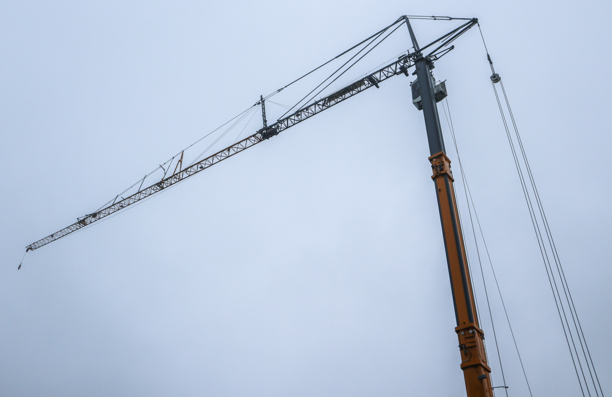 Im Laufkatzbetrieb hat der Ausleger eine maximale Länge von 58,5 Metern. Der Ausleger kann bei Bedarf auch in einem Winkel von 15, 30 oder 45 Grad gestellt werden. Im Wippmodus ist der Ausleger 60, 62,5 oder 65 Meter lang. Hier ist der Kran im Wippmodus mit einem 60 Meter langen Ausleger aufgebaut.