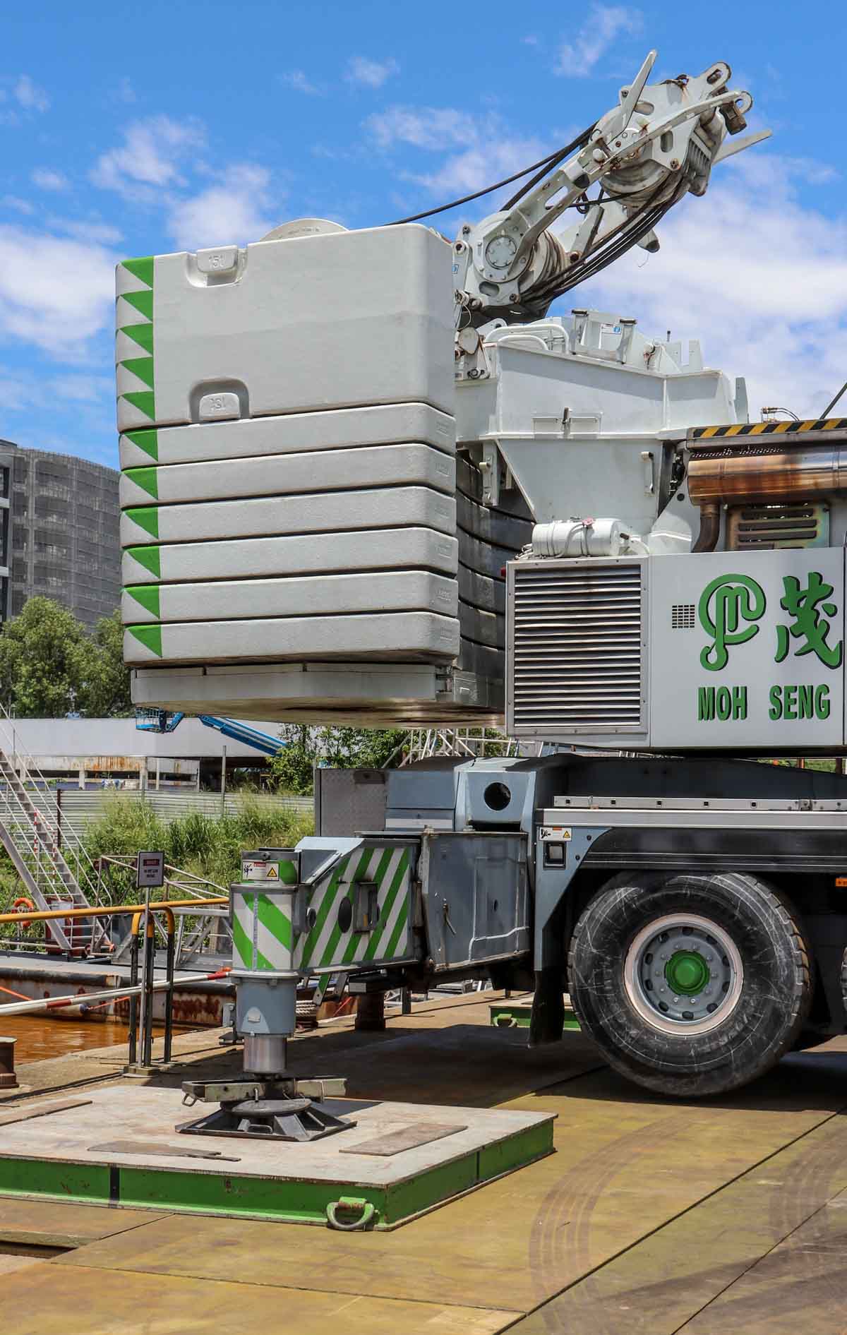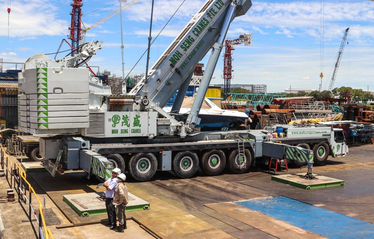 Hier sollte der beeindruckende Liebherr LTM 1500-8.1 von Moh Seng aus Singapur (SG) zum Heben eines Katamarans eingesetzt werden.