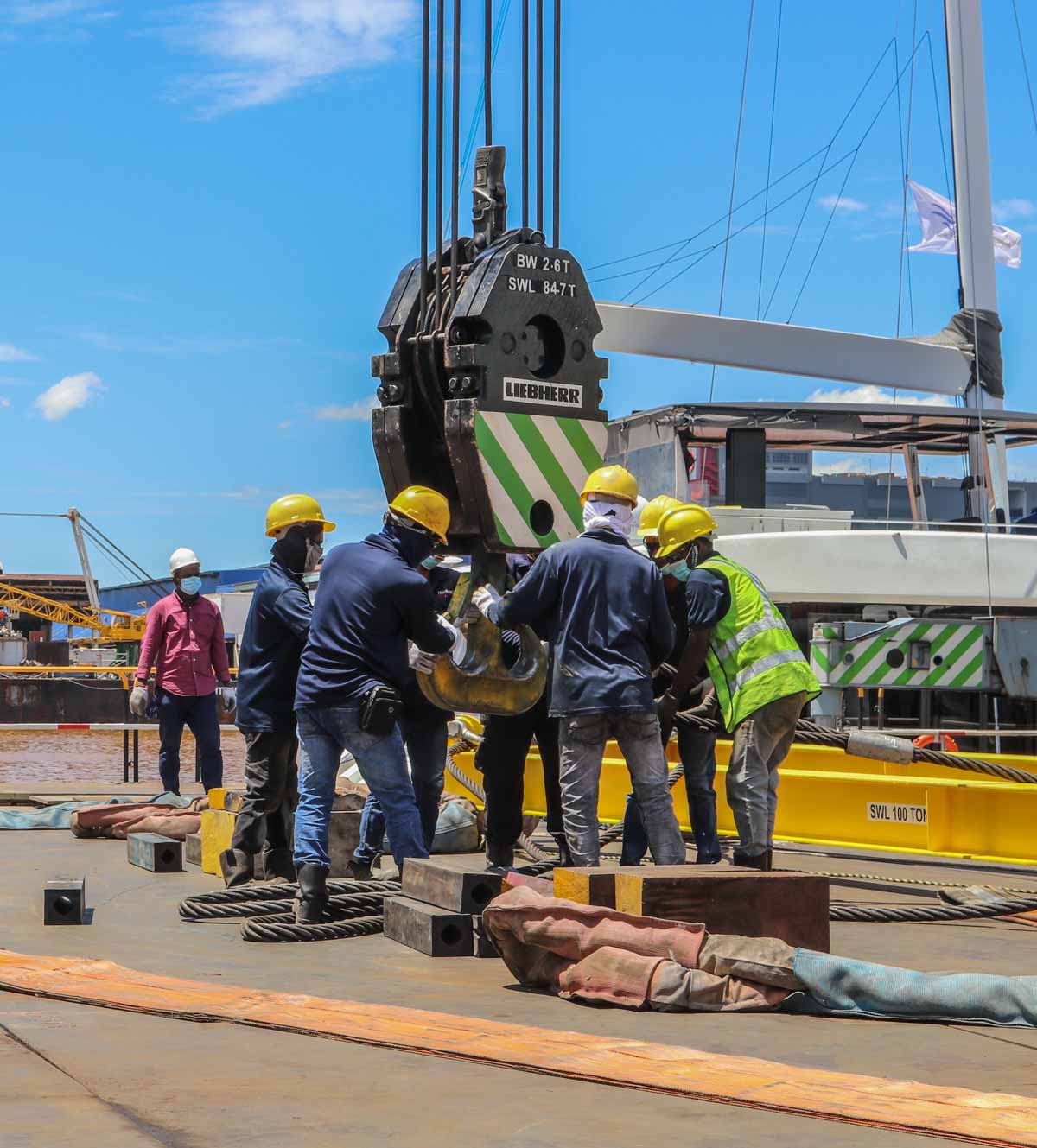 Es wird ein 100-Tonnen-Hubrahmen in Kombination mit einer langen Anschlagkette verwendet.