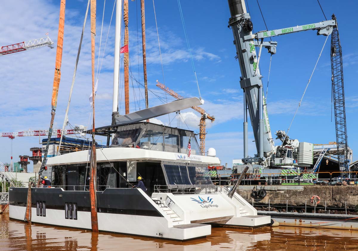 Hier kommt der Katamaran bereits angefahren. Der lange Segelmast wird beim Heben eine Herausforderung darstellen.