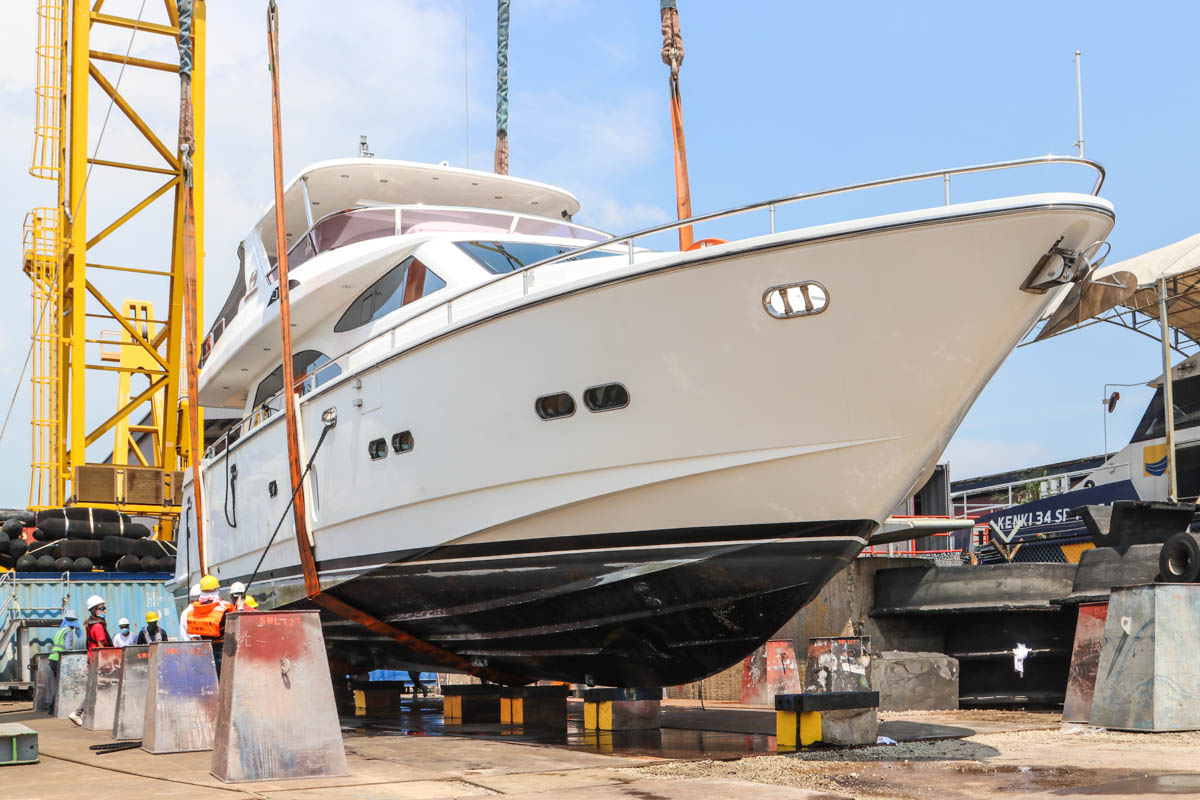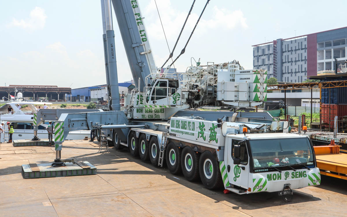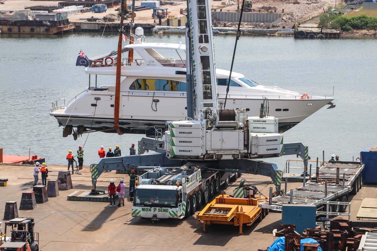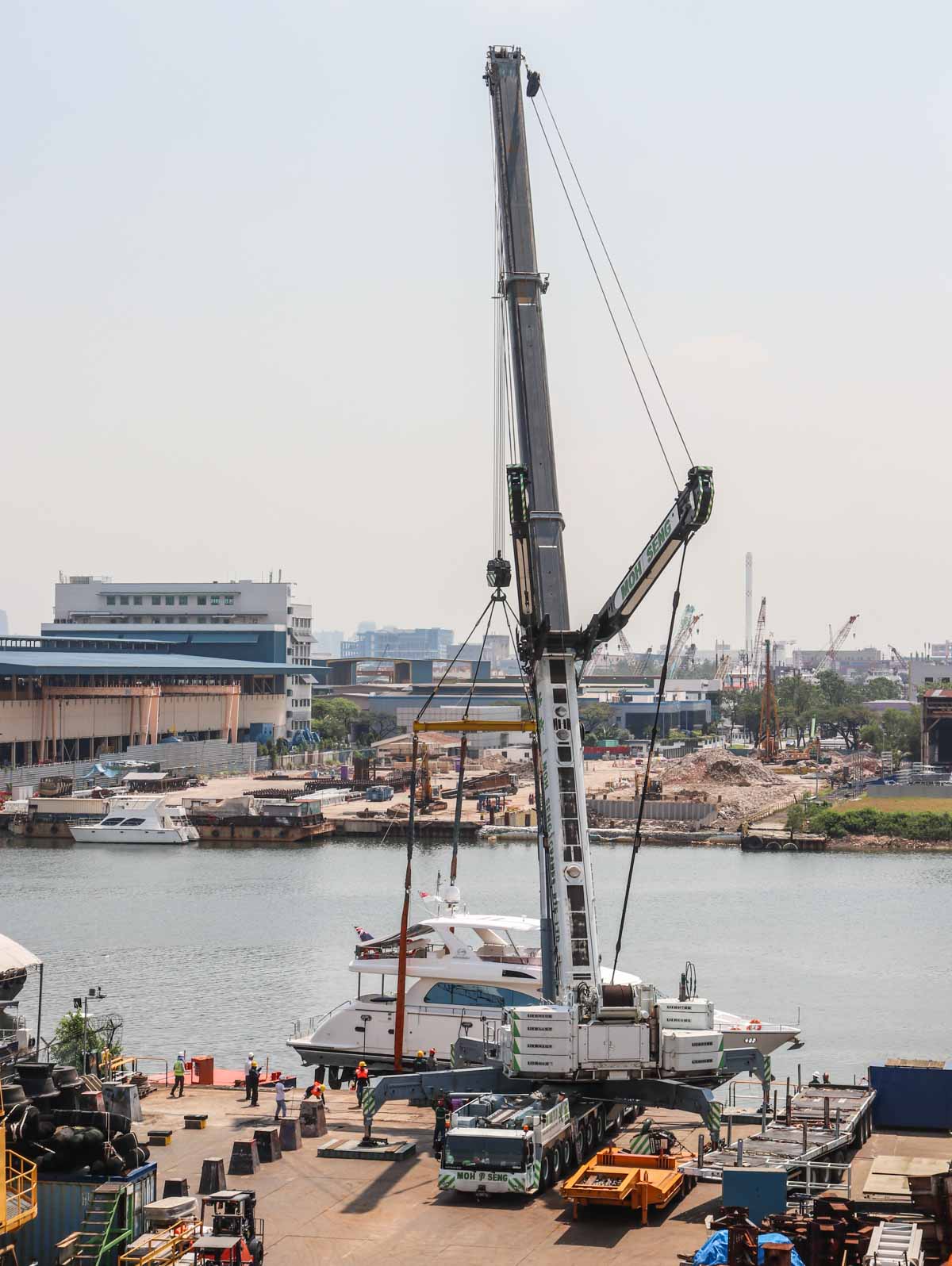 Der beeindruckende Liebherr LTM 1750-9.1 von Moh Seng aus Singapur (SG) steht hier bereit, um eine Yacht aus dem Wasser zu heben.