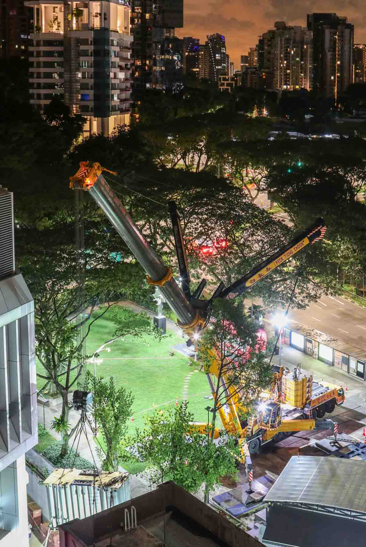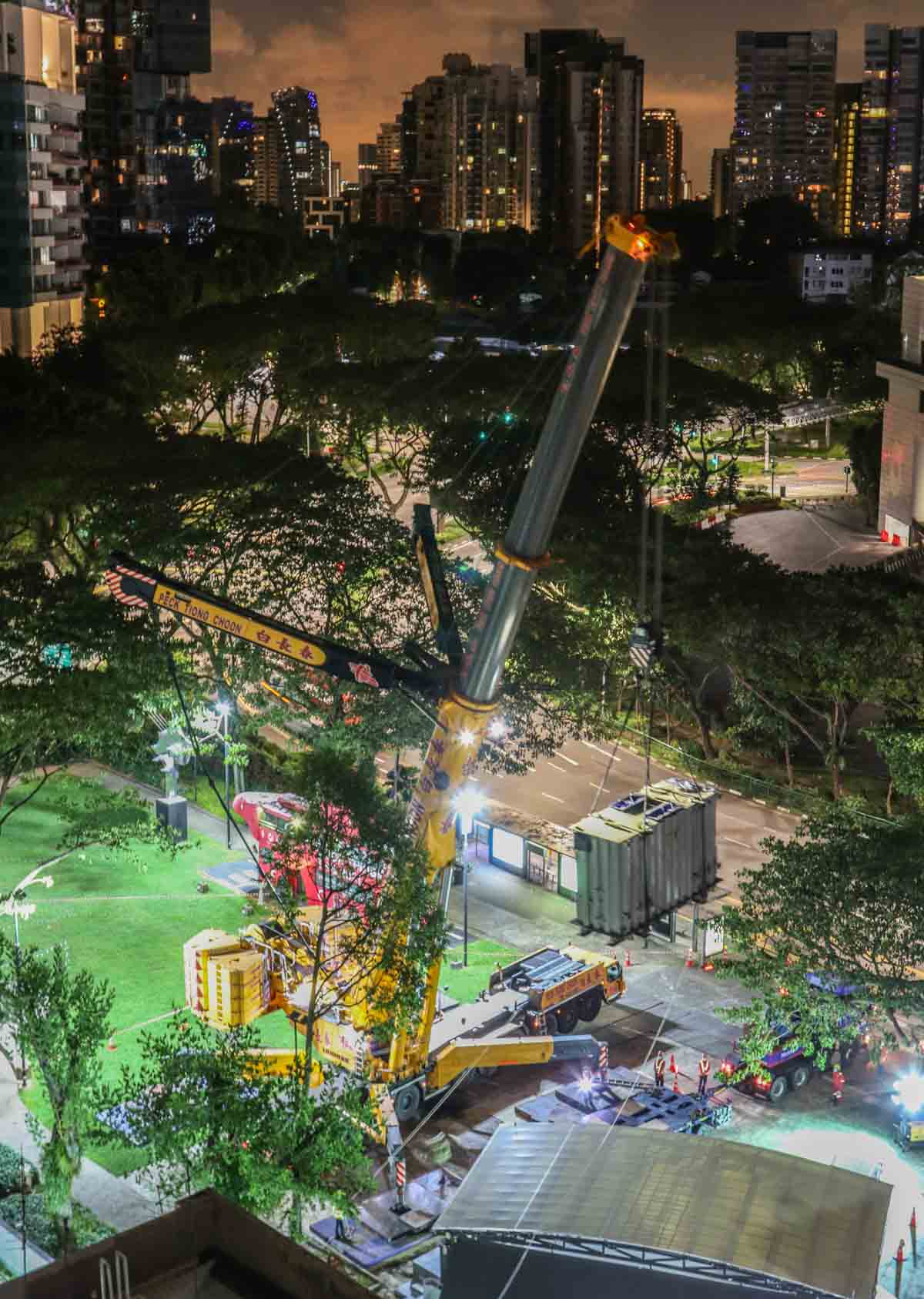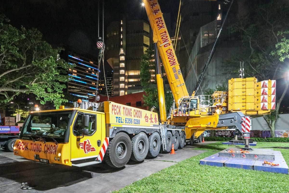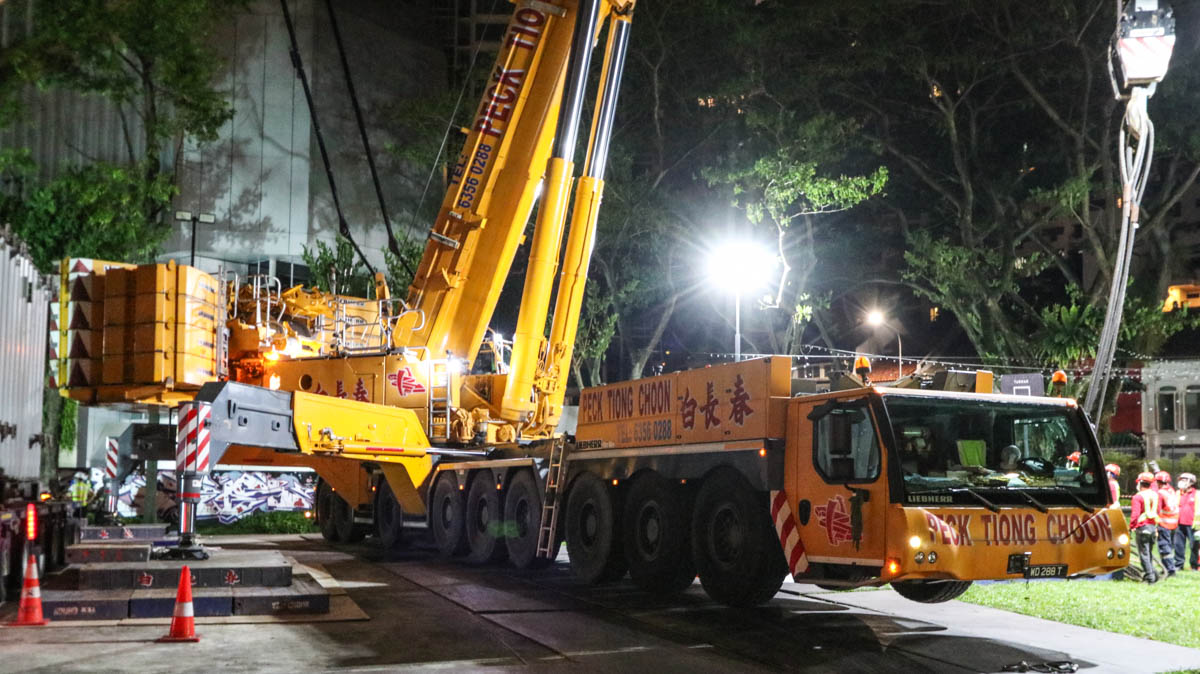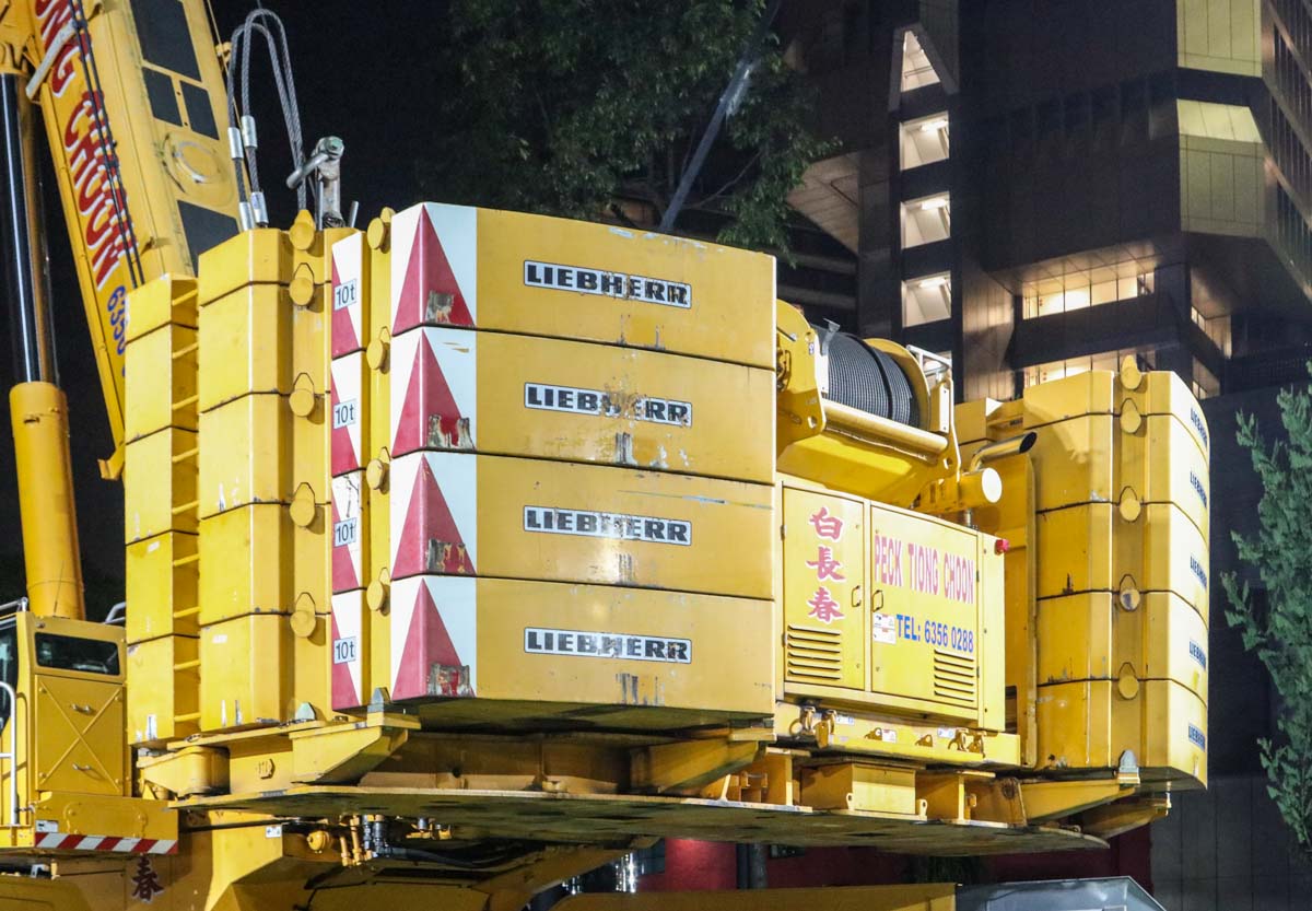 Der attraktive Liebherr LTM 1750-9.1 von Peck Tiong Choon aus Singapur (SG) wurde in den Nachtstunden eingesetzt, um zwei Transformatoren im Stadtzentrum auszutauschen. Einige Wochen zuvor wurde am gleichen Ort bereits der LTM 1750-9.1 von Moh Seng eingesetzt.