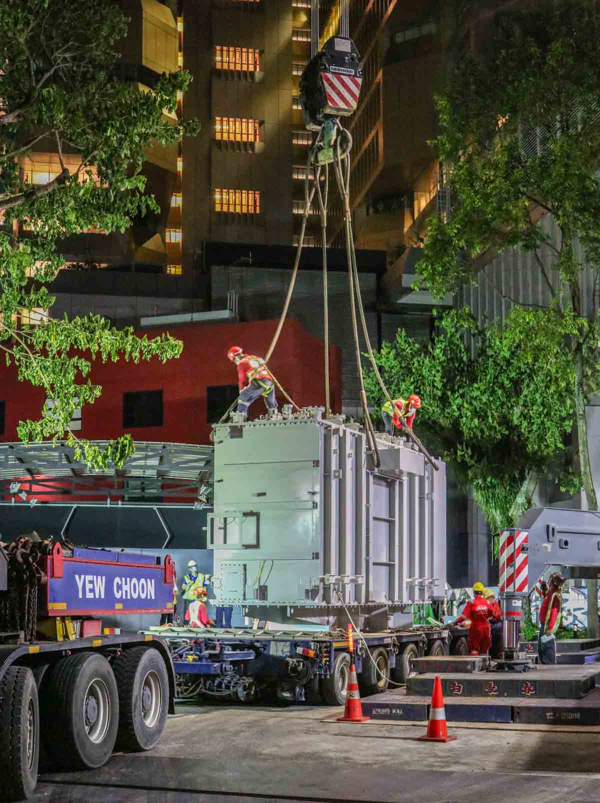 Der Transformator wird auf einen bereitstehenden Auflieger von Yew Choon verladen.