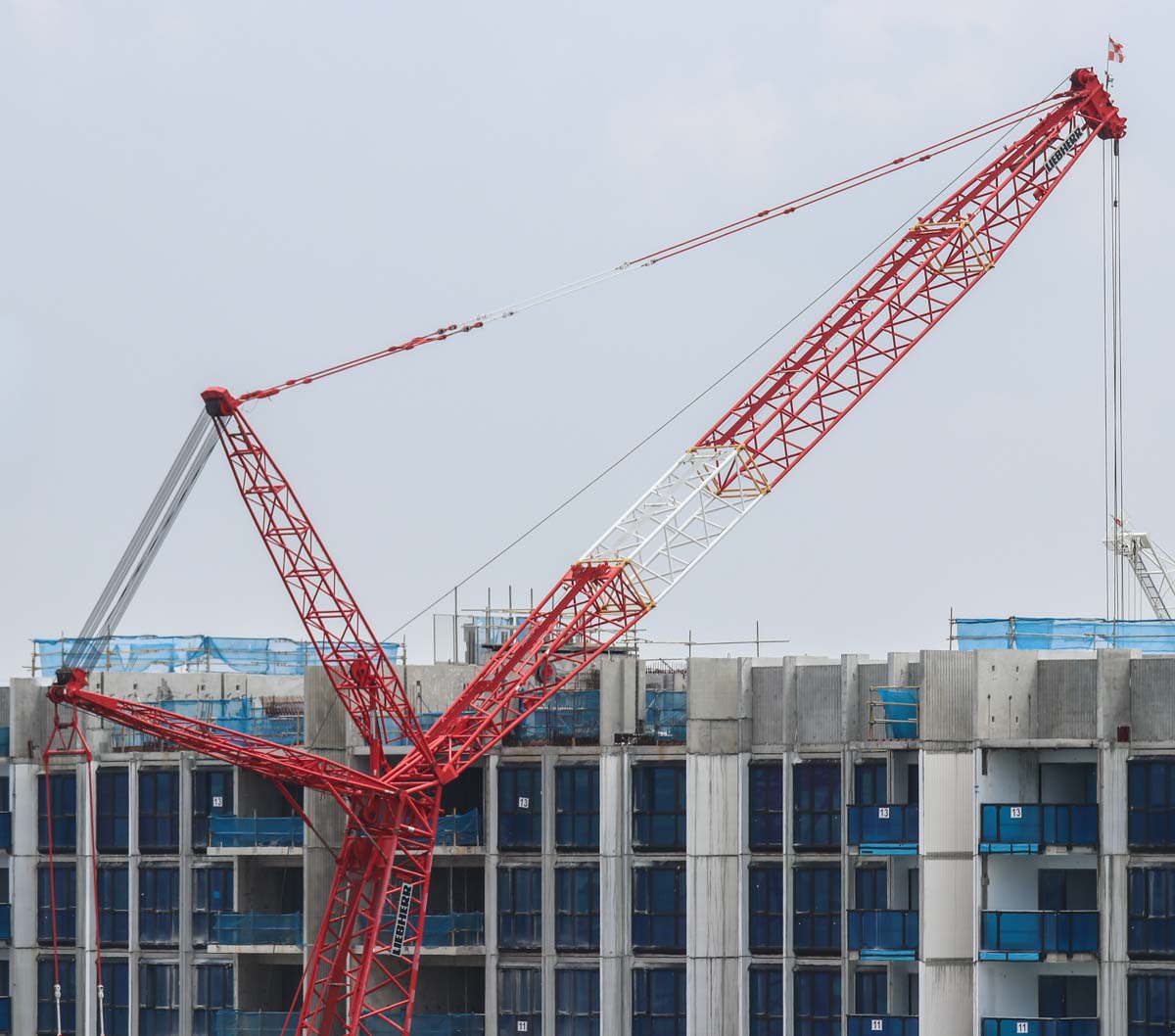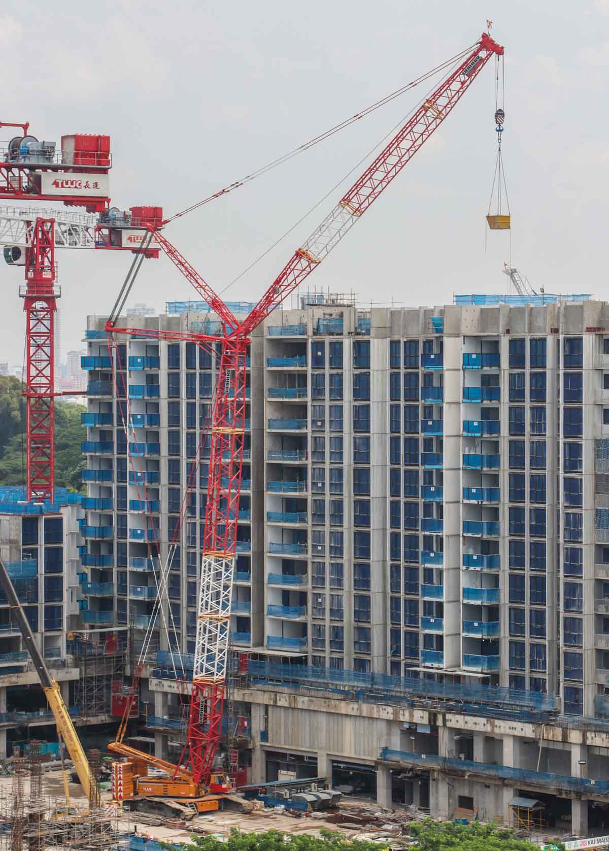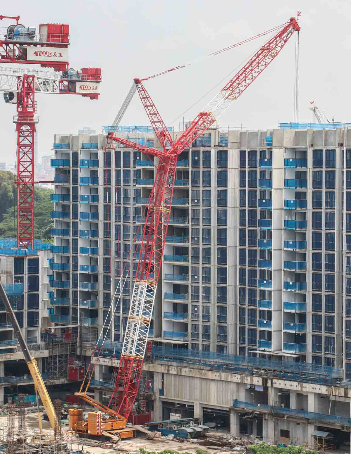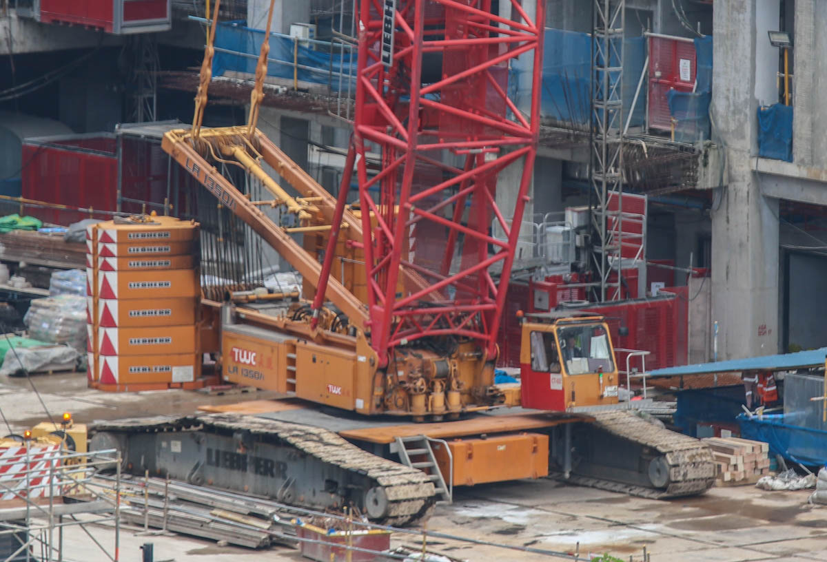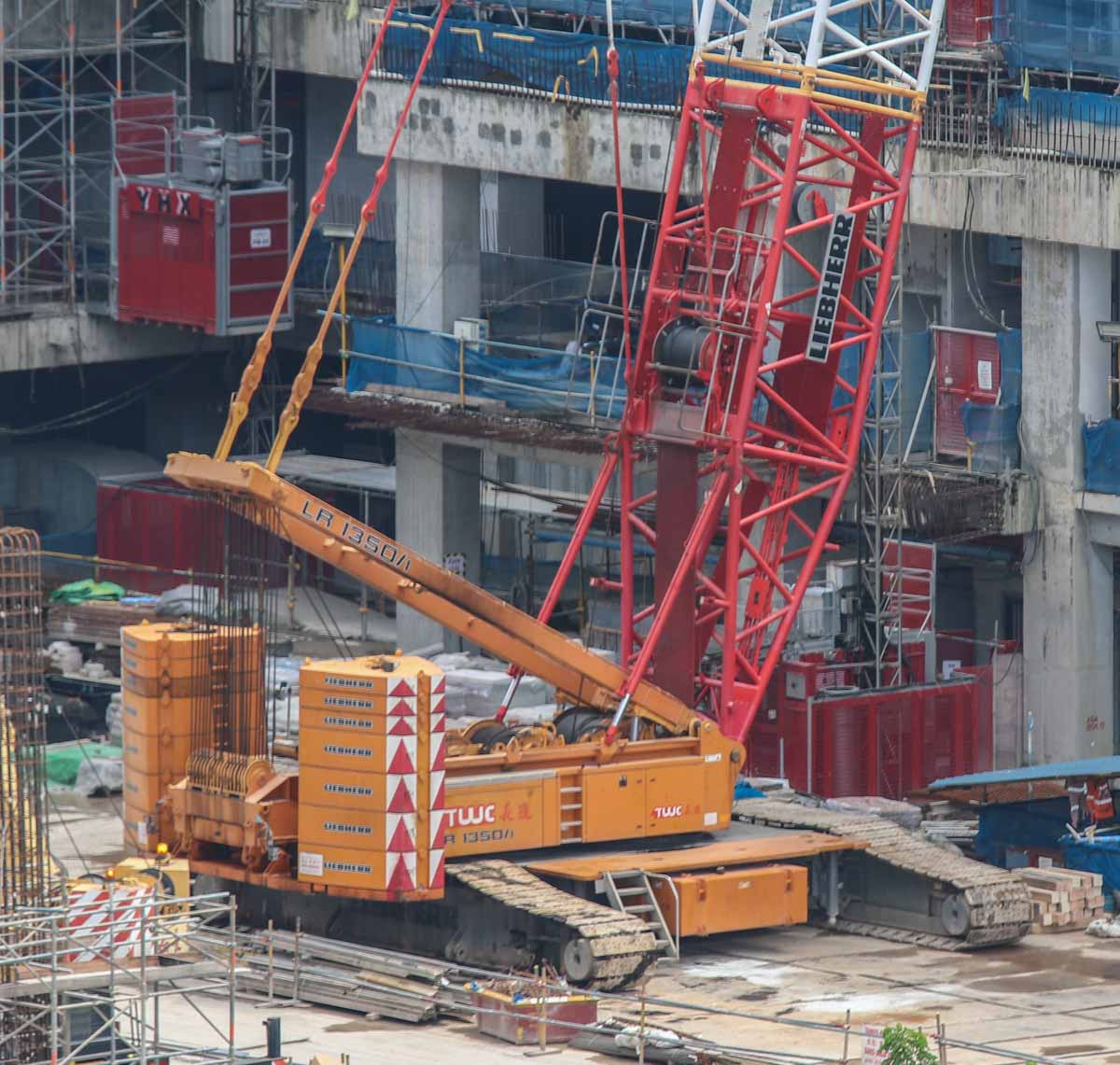 Dieser attraktive Liebherr LR 1350/1 von Tiong Woon aus Singapur (SG) wurde auf einer großen Baustelle eingesetzt. Es handelt sich um einen 350-Tonnen-Raupenkran, der in SW-Konfiguration aufgebaut ist; mit Hauptausleger und Wippausleger. Der Hauptausleger ist hier 42 Meter lang und der Wippausleger ist 36 Meter lang.