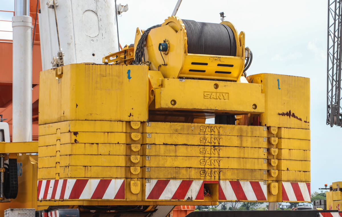 Der beeindruckende Sany SAC6000 von Hiap Tong aus Singapur (SG) wurde bei der Demontage mehrerer Hafenkrane eingesetzt. Es ist ein 600-Tonnen-Kran, montiert auf einem 8-achsigen Unterwagen aus dem Baujahr 2019.