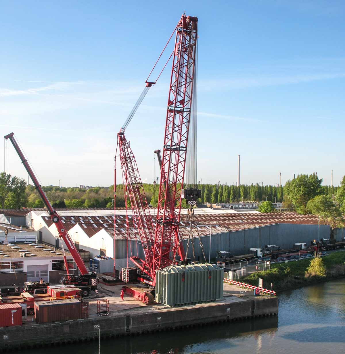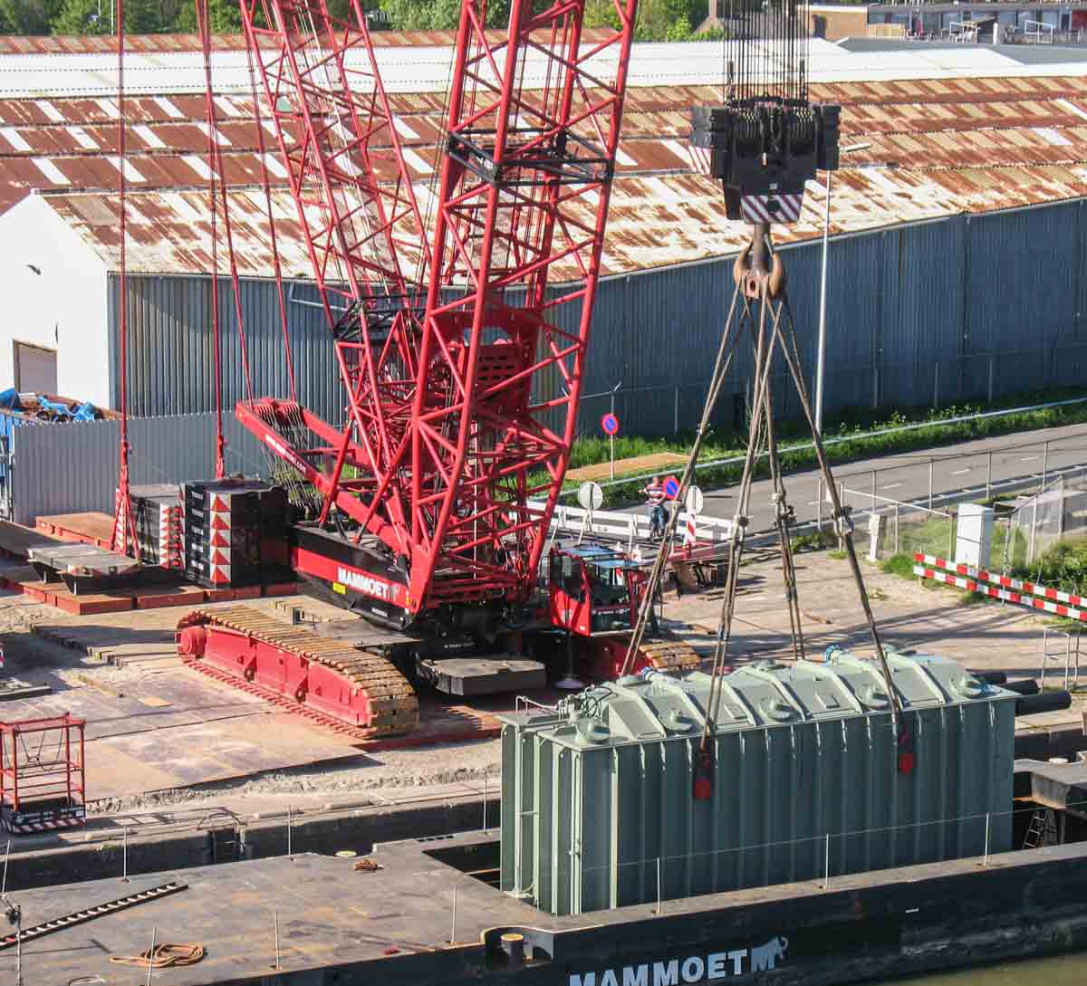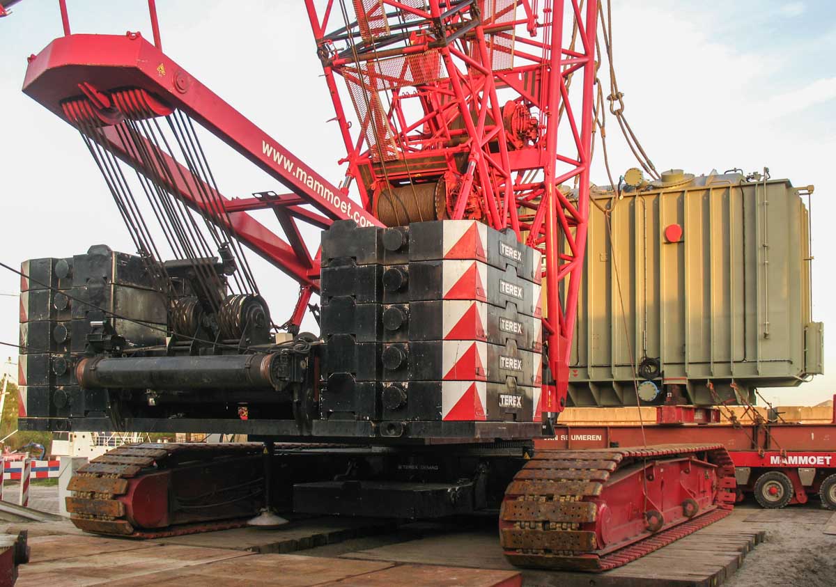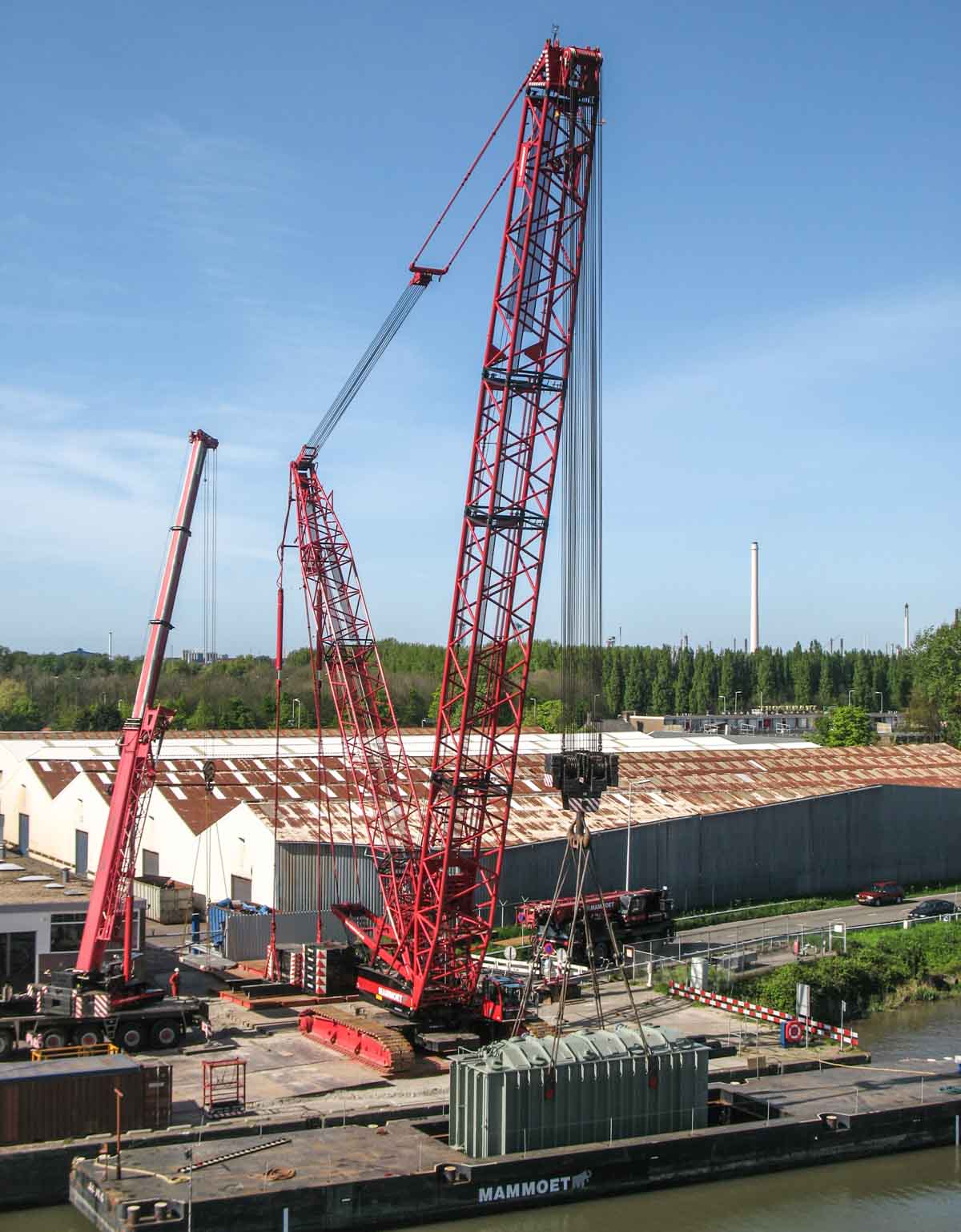 Im Frühjahr 2009 setzte Mammoet aus Schiedam (NL) diesen beeindruckenden Terex CC 2400-1 ein, um einen schweren Transformator aus einem Ponton zu heben. Der Terex CC 2400-1 ist ein 400-Tonnen-Raupenkran.