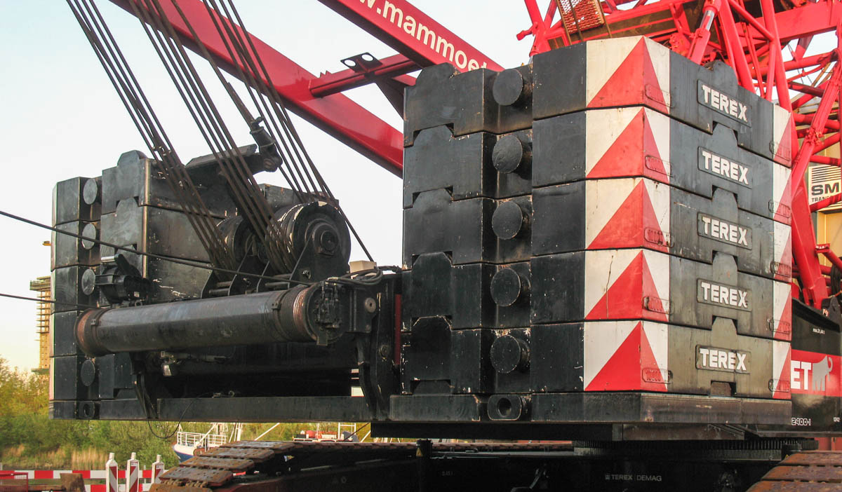 Hier war der Kran mit einem 600-Tonnen-Liebherr-Haken konfiguriert, was in der Regel möglich ist, wenn das Hubseil denselben Durchmesser hat. Der Haken war auf 30 Einscherungen gesetzt und hat ein Eigengewicht von etwa 16 Tonnen.