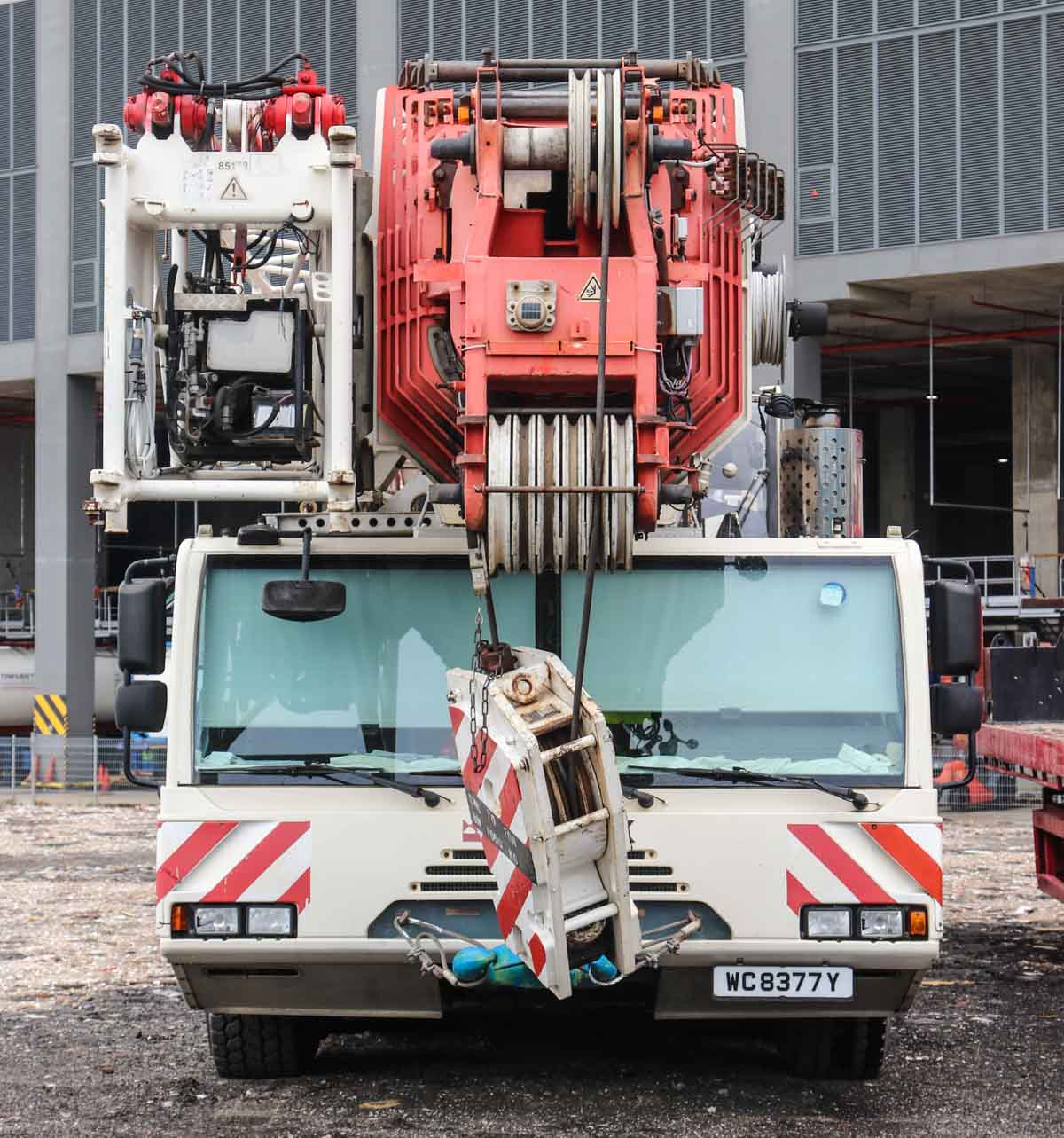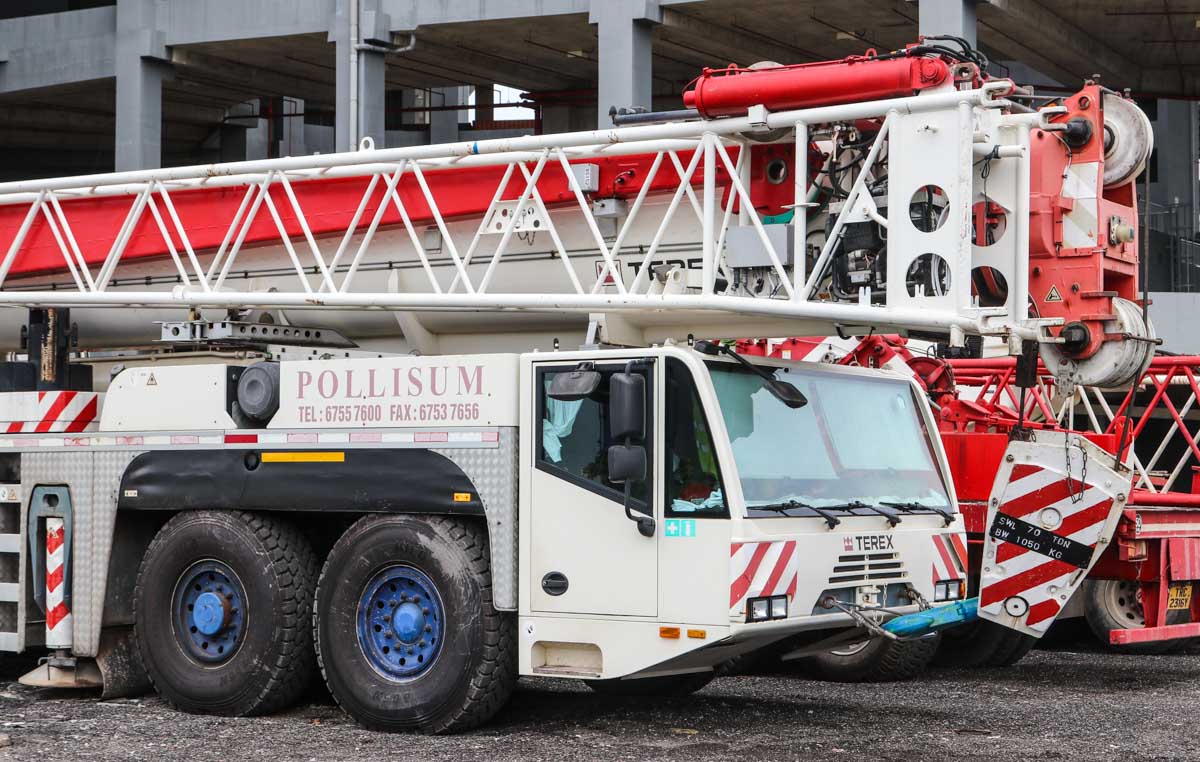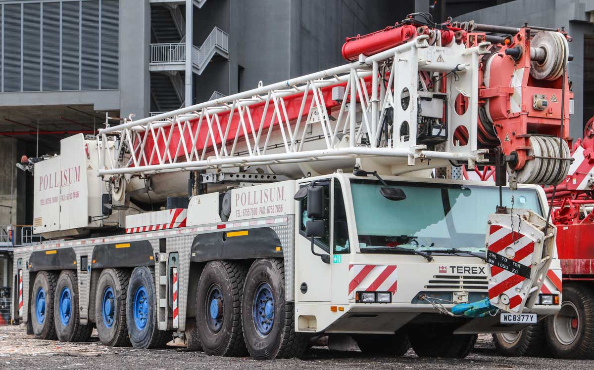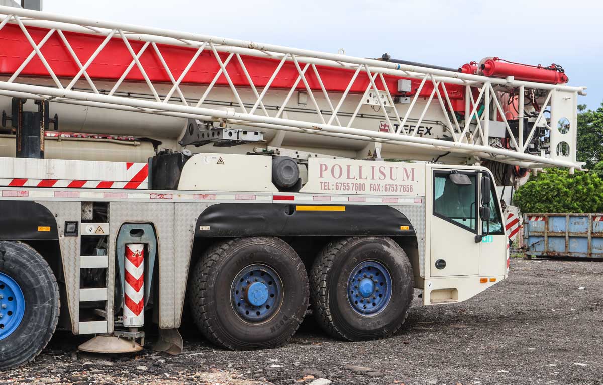 Dieser attraktive Terex AC 250-1 gehört Pollisum aus Singapur (SG) und stand auf einem Betriebshof geparkt. Es handelt sich um einen 250-Tonnen-Mobil-Teleskopkran, der auf einem sechsachsigen Unterwagen montiert ist.