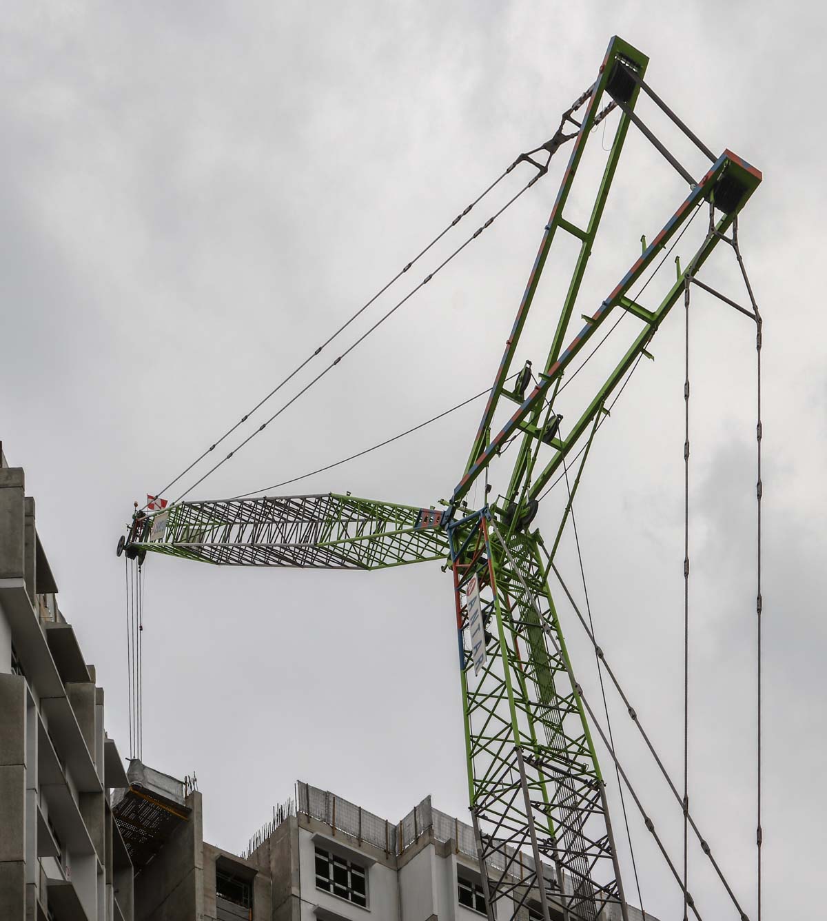 Hier war der Kran in SW-Konfiguration aufgebaut, also mit einer Wippauslegerjib. Der Wippausleger besitzt eine Basislänge von 27 Metern und kann auf maximal 60 Meter verlängert werden.