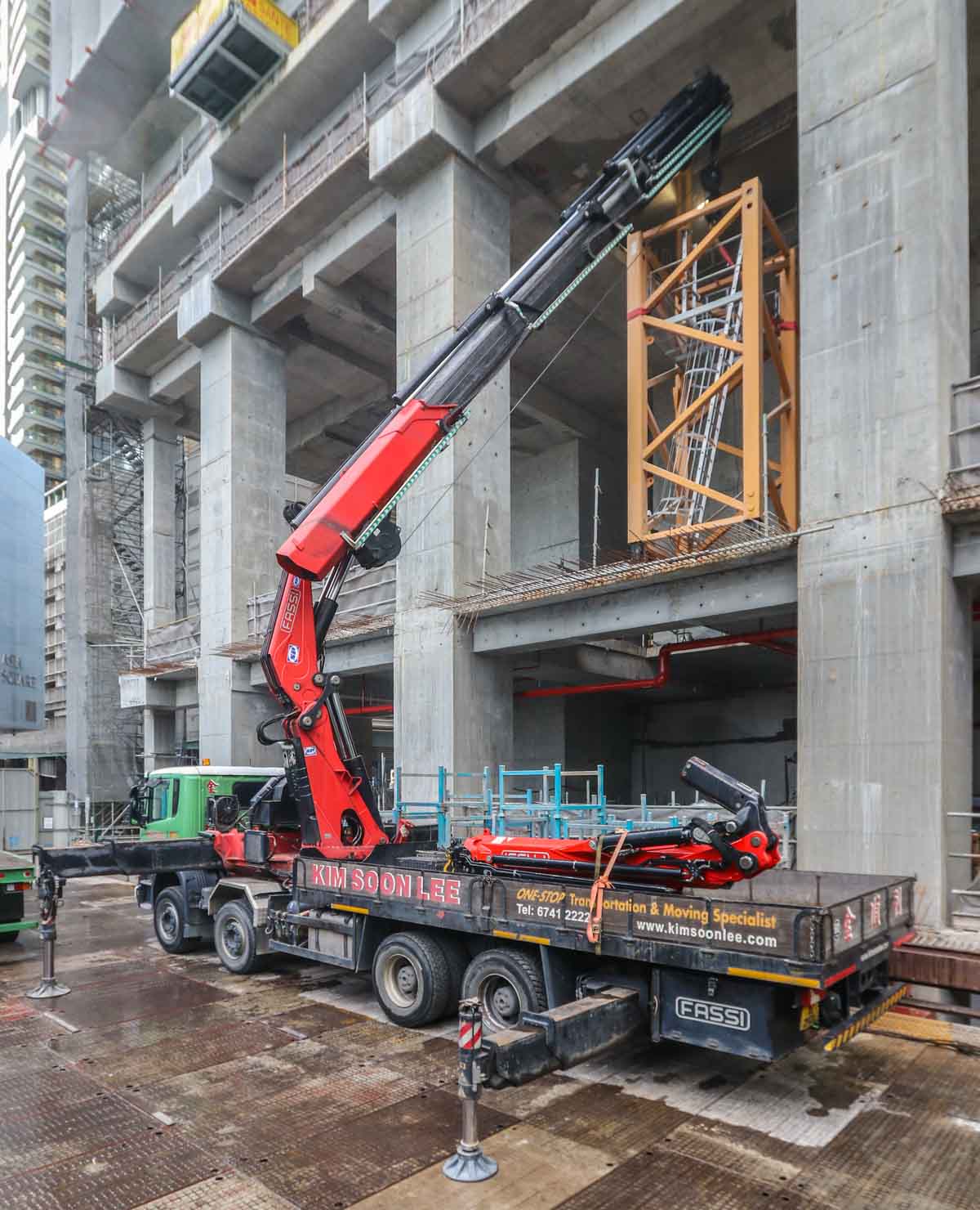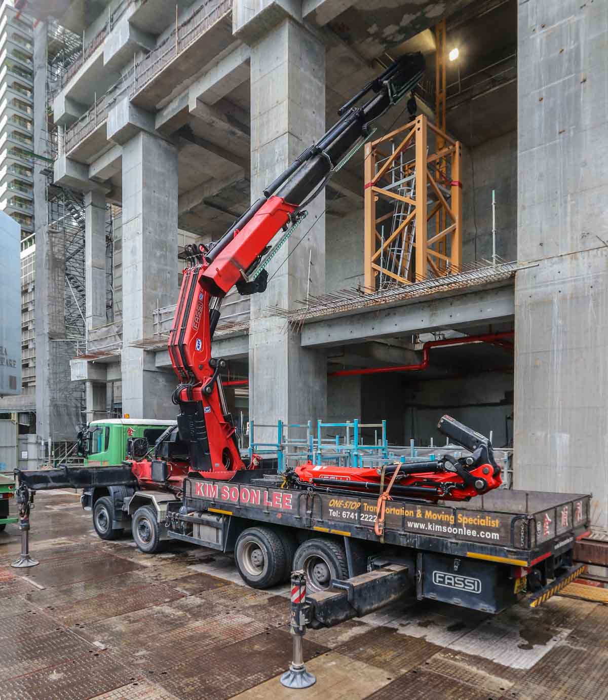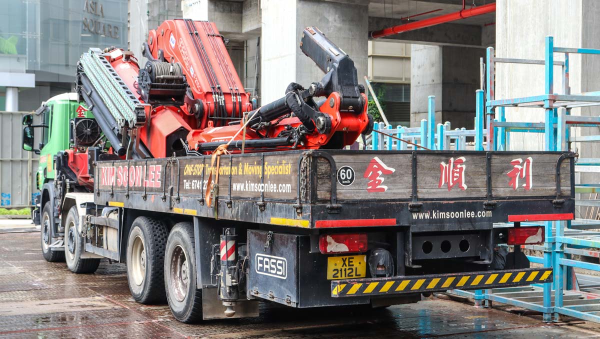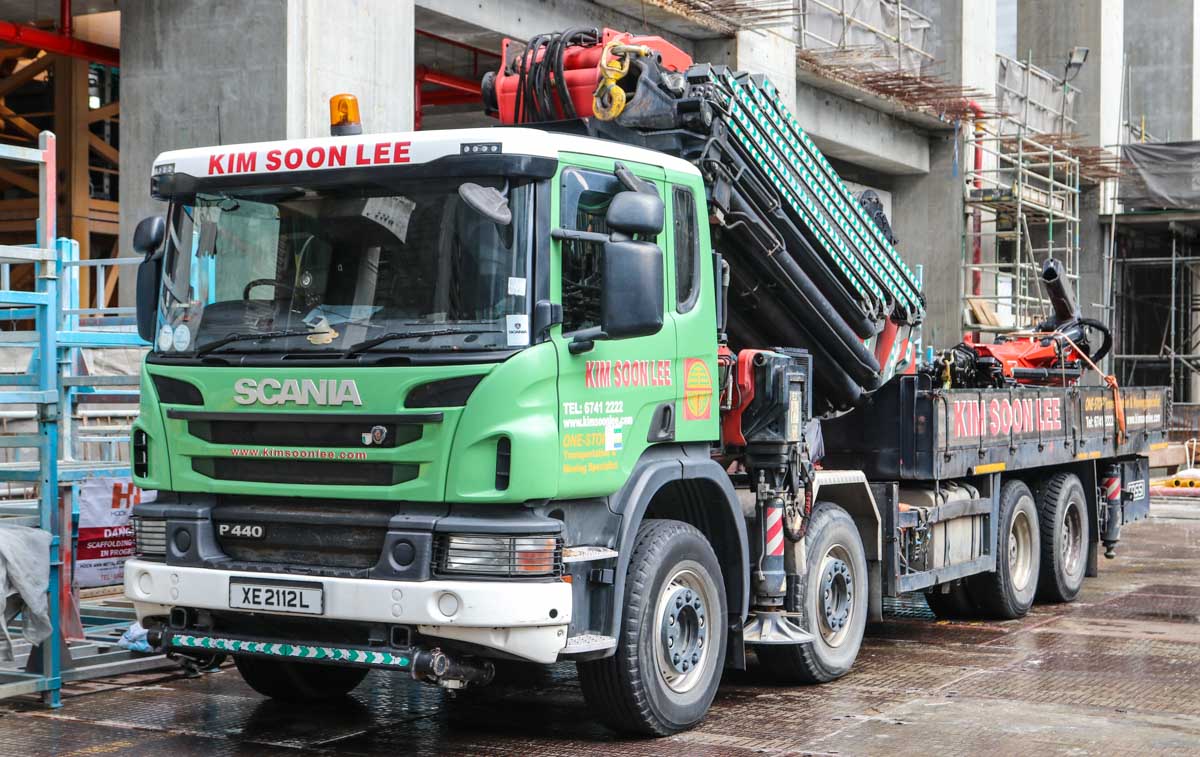 Dieser interessante Scania P 440 Pritschenwagen mit schwerem Ladekran von Kim Soon Lee aus Singapur (SG) sollte für einen besonderen Hebeeinsatz im Stadtzentrum eingesetzt werden.
