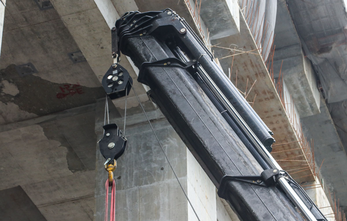 Der Fassi wurde hier mit Winde und Lasthaken eingesetzt. Die Winde hat eine Kapazität von 5 Tonnen und kann mit vier Einscherungen maximal 20 Tonnen heben. Hier war der Haken mit drei Einscherungen konfiguriert und die maximale Kapazität beträgt 15 Tonnen. Für diesen Einsatz war das ausreichend.