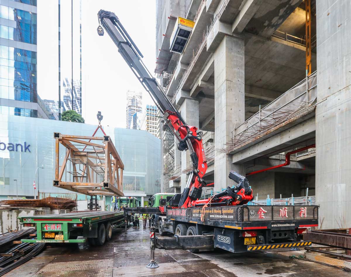 Mit dieser Last kann eine Ausladung von etwa 11,5 Metern erreicht werden. Die Herausforderung bestand hier darin, das Turmstück vertikal aus dem Gebäude zu heben.