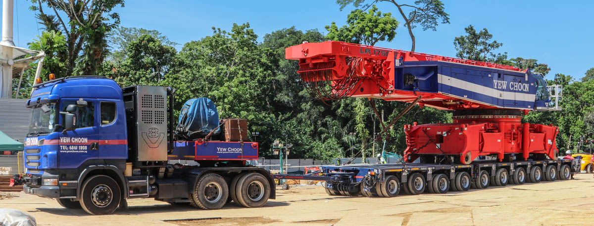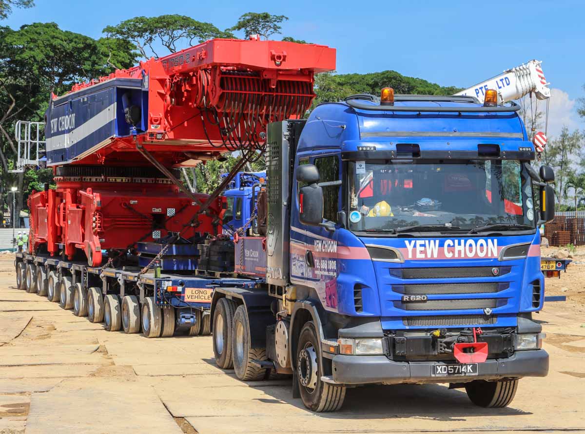 Hier wurde der schöne Scania R 620 von Yew Choon aus Singapur (SG) für den Transport eines Raupenträgers des neuen Liebherr LR 1750/2 von Yew Choon eingesetzt.