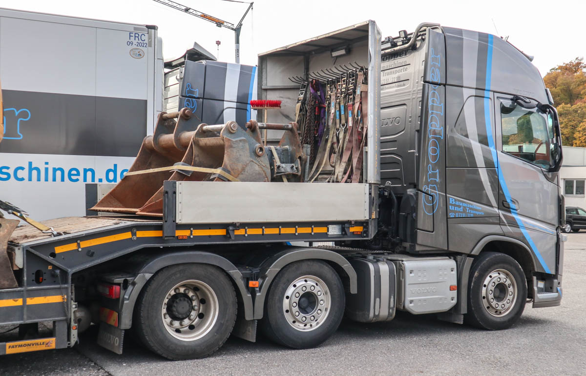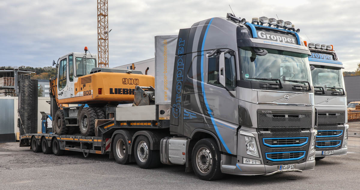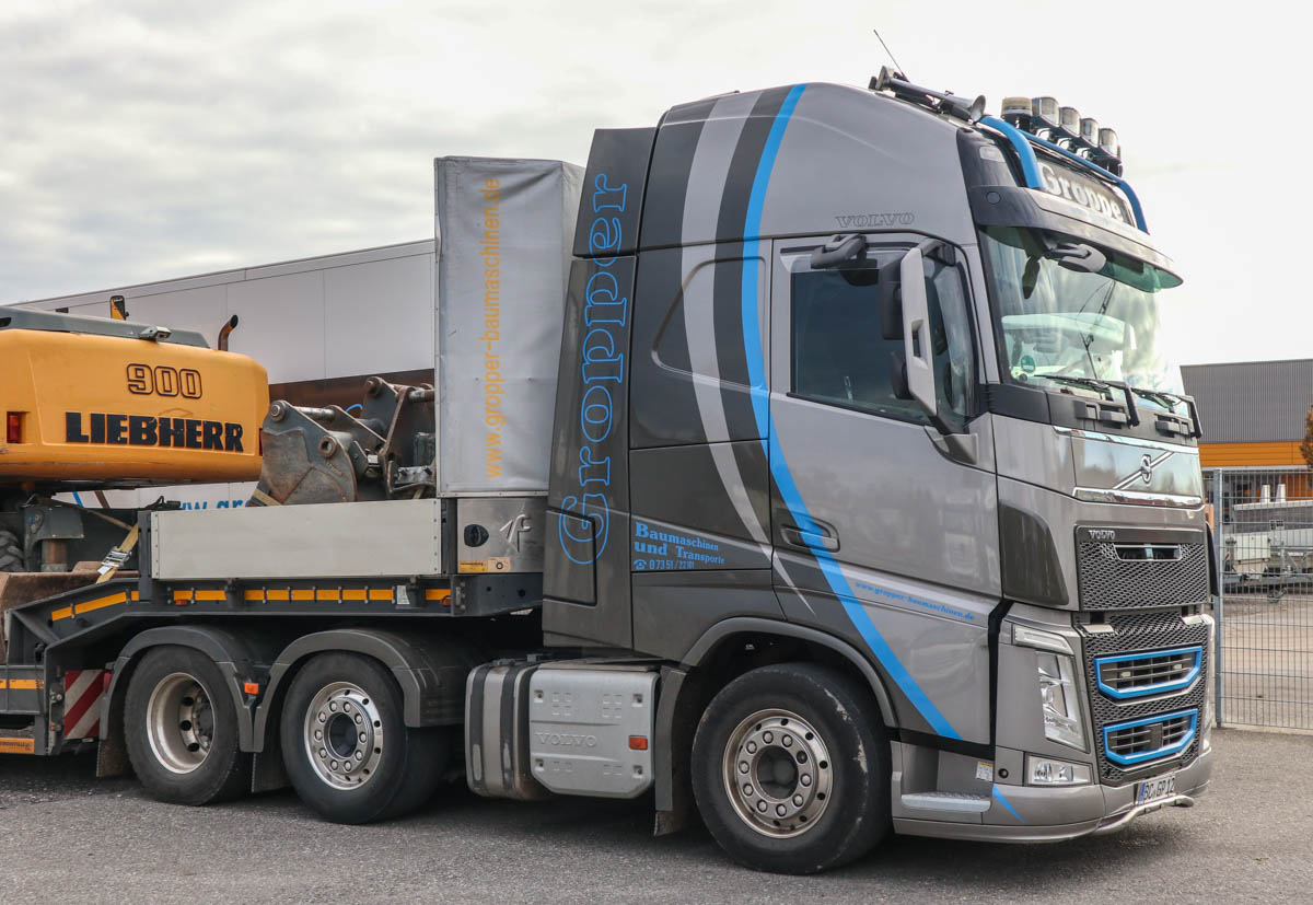 Dieser attraktive Volvo FH 540 gehört Gropper Baumaschinen aus Ummendorf (DE) und stand während eines Wochenendes auf einem Industriegelände geparkt. Die Kombination besteht aus einer 3-achsigen Zugmaschine mit einem 3-achsigen Auflieger.