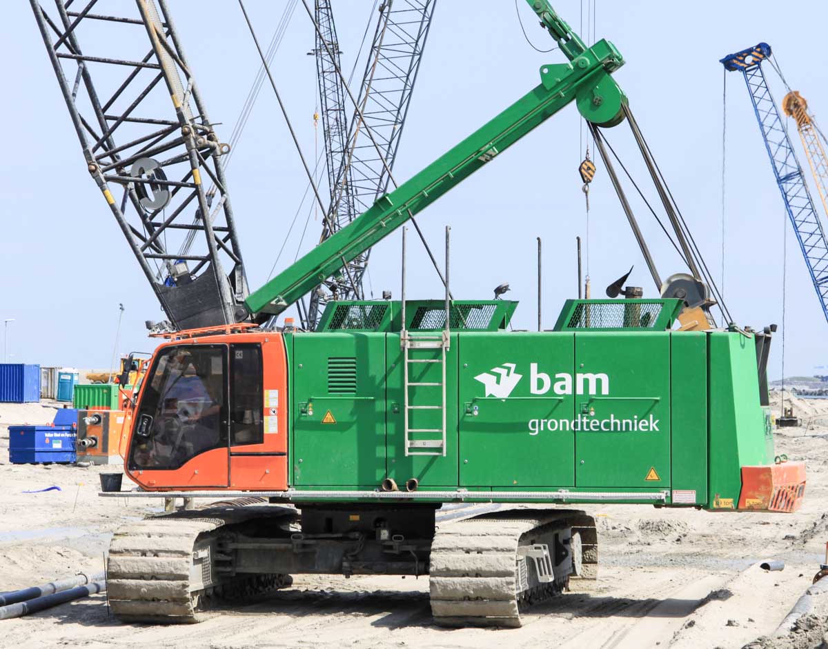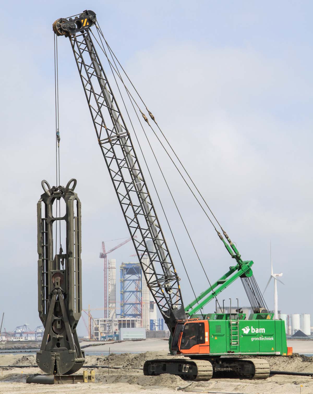 Der Liebherr HS 875 HD Seilbagger von BAM Grondtechniek auf einem Einsatz mit Schlitzwandgreifer auf der zweite Maasvlakte (NL).