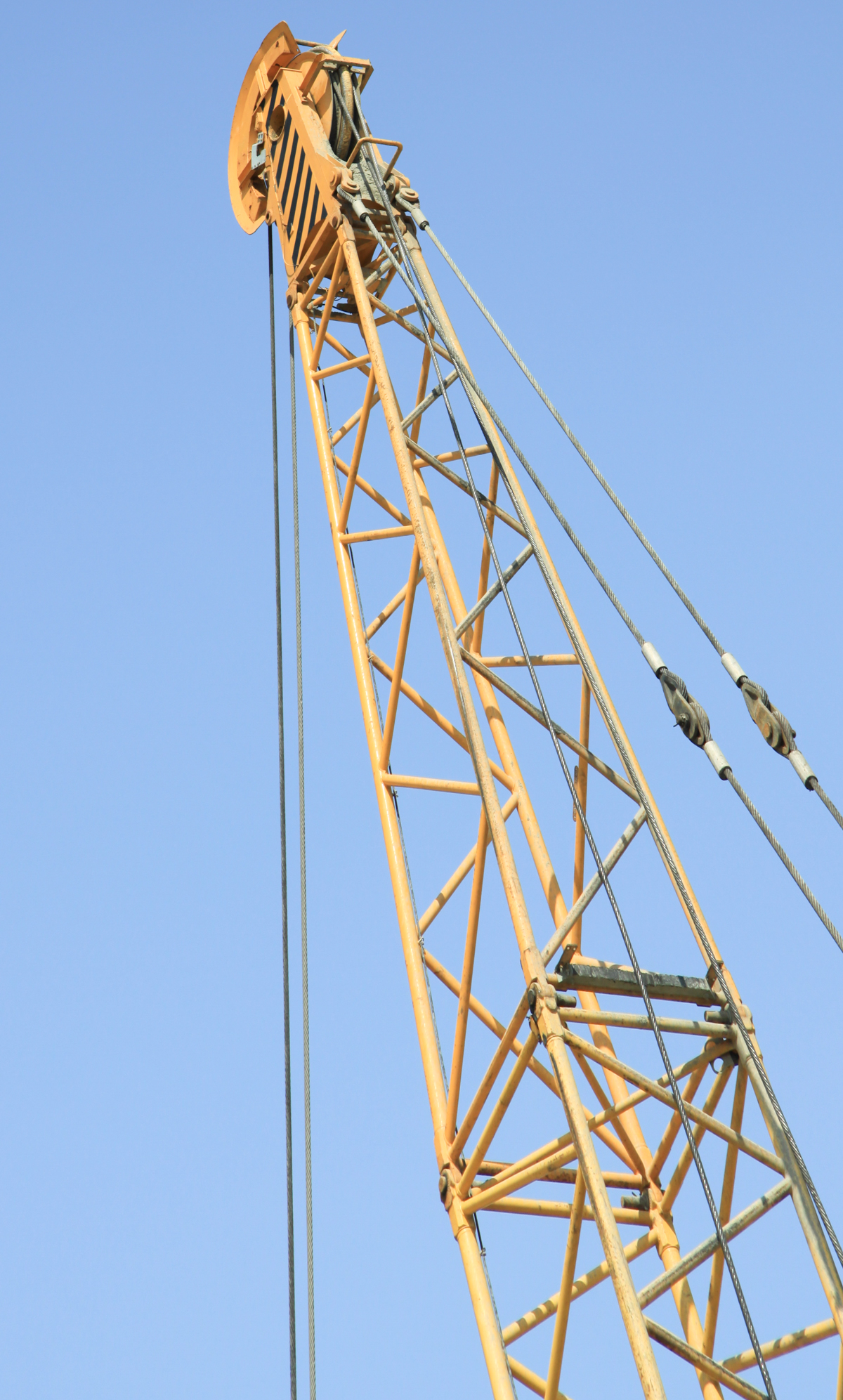 Das Ausleger-Kopfstück mit zwei Stahl-Seilrollen wurde hier benutzt, auch bekannt als "Dragline-Kopfstück" - dieser Kran wurde als gebrauchter Schleppschaufelkran aus Dänemark gekauft.