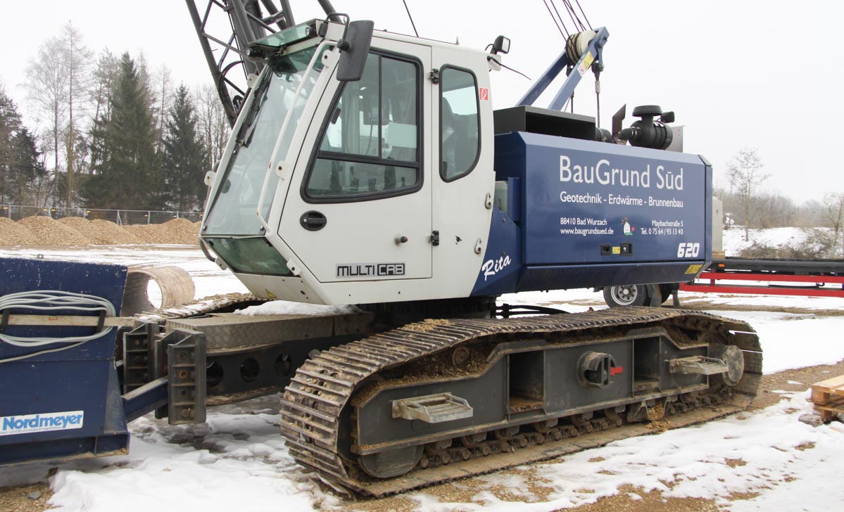 Die Firma BauGrund Süd aus Bad Wurzach (DE) setzt diesen interessanten Sennebogen 620 HD mit Verrohrungsmaschine und Bohrgreifer ein zum Bohren nach Großbrunnen für Bewässerungsanlagen oder zur termischen Nutzung. Der Spitzname dieses Krans ist "Rita".