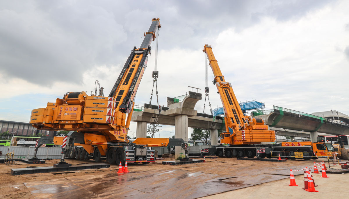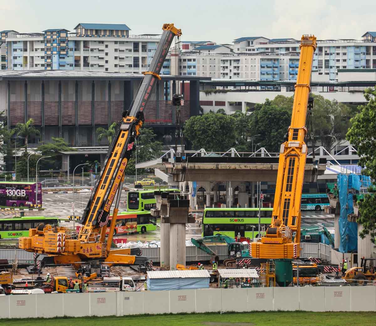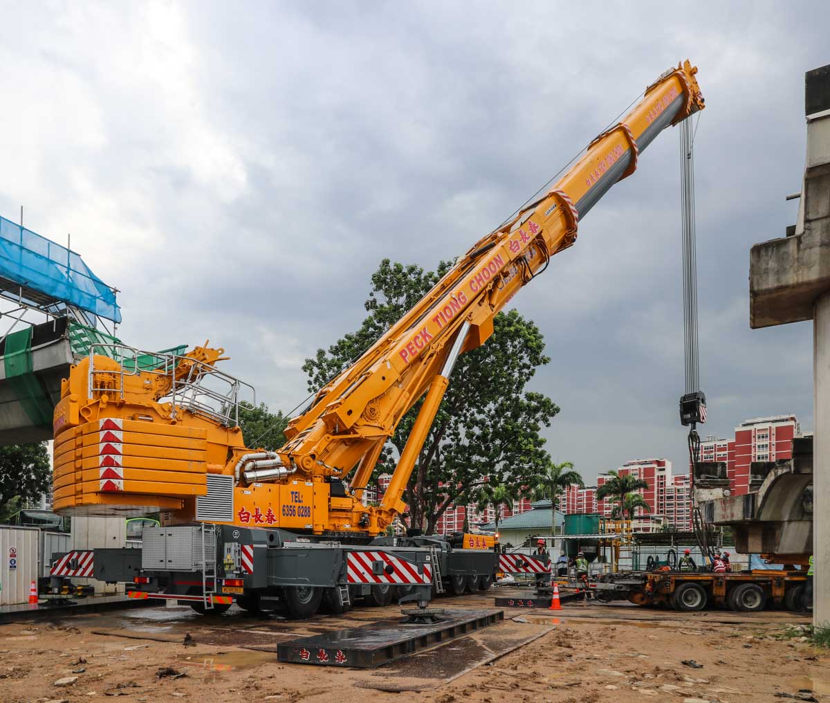 Two large mobile cranes from Peck Tiong Choon from Singapore (SG) are being prepared on a construction site there for heavy lifting operations.