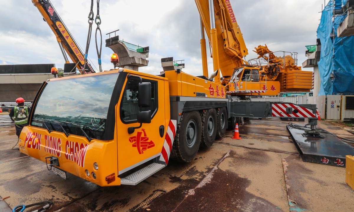 The LTM 1750-9.1 lifts a total of 78 tonnes at a maximum radius of 16 metres, while the LTM 1500-8.1 lifts a total of 80 tonnes at a radius of 14 metres. The segment is loaded onto a transport combination of Peck Tiong Choon and will be transported to a demolition site during the night.
