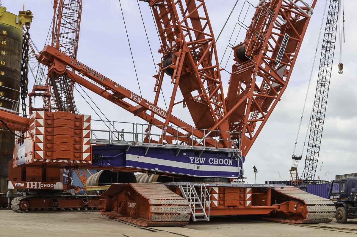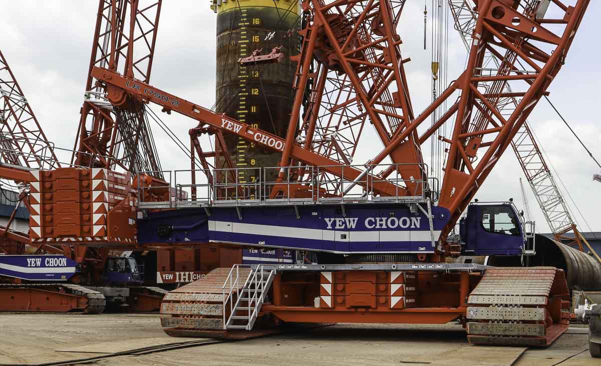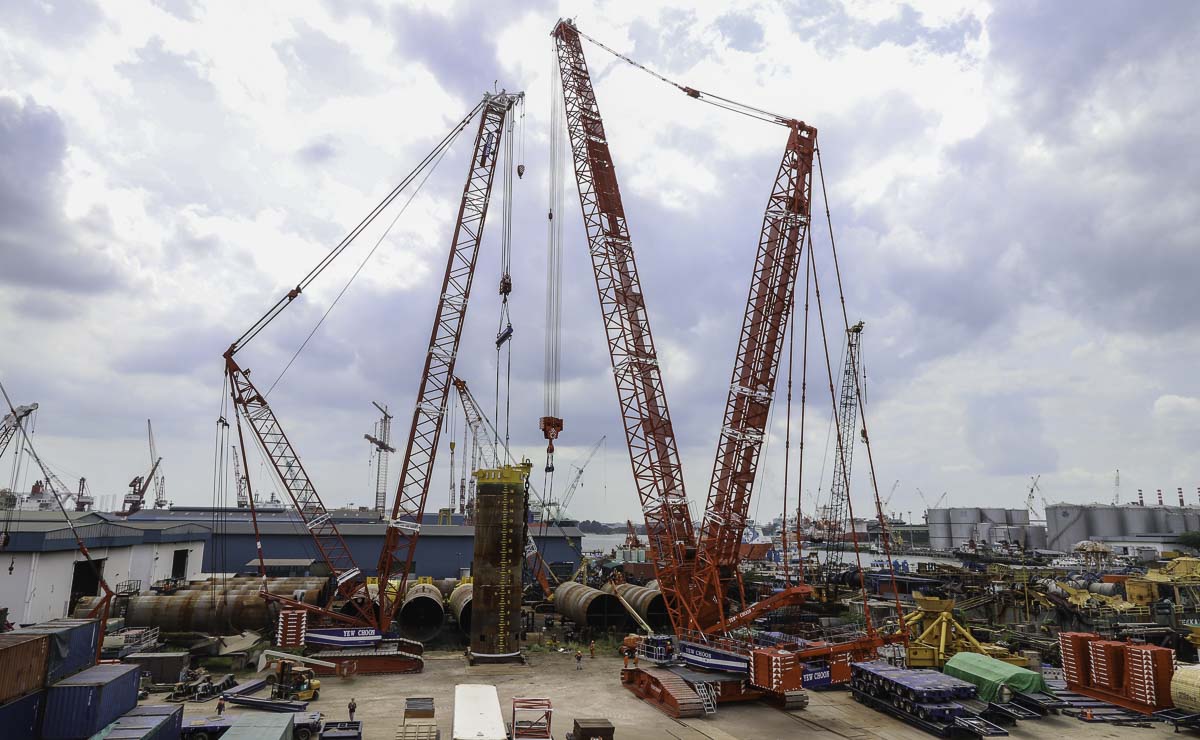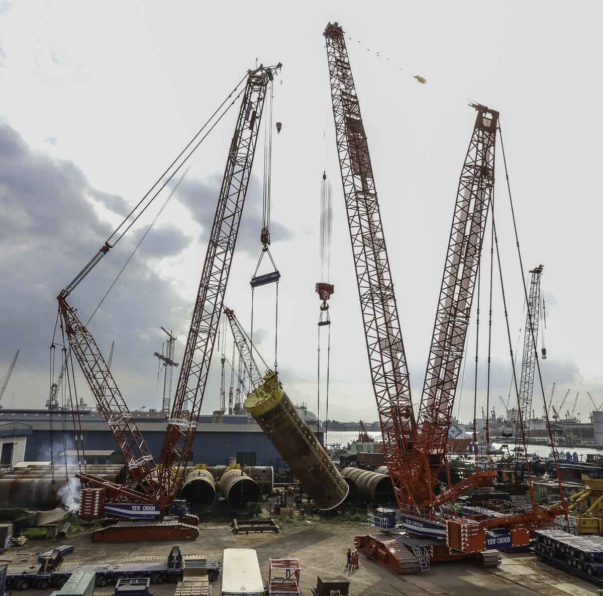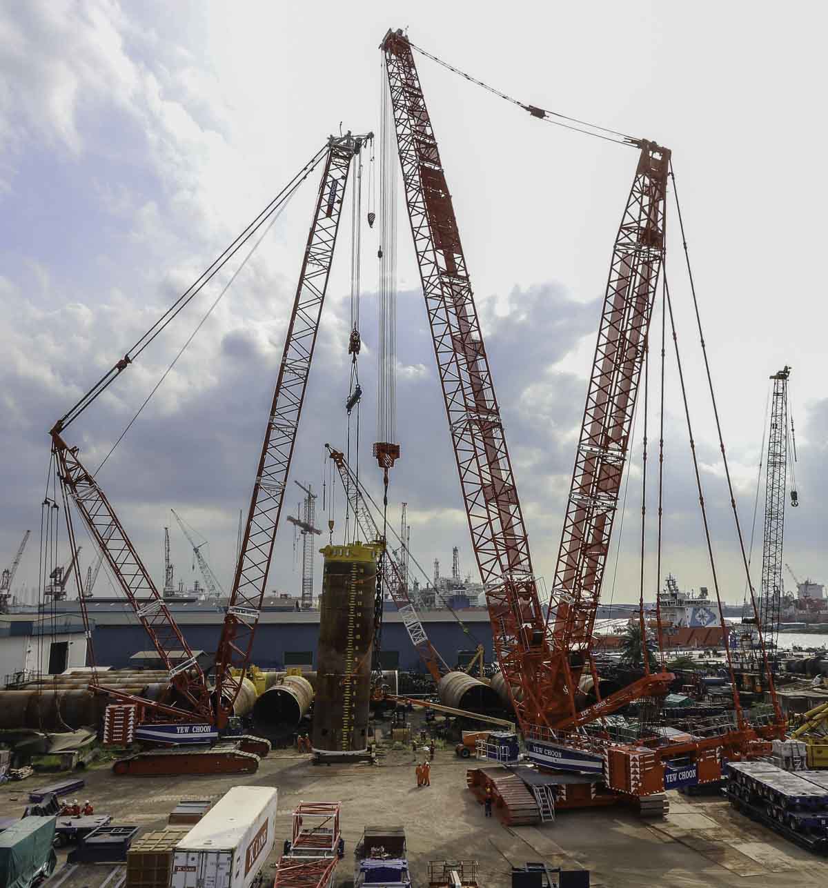 To tilt a heavy pile on the yard of Yew Choon in Singapore (SG) would both of their large crawler crane come to action. These are the Liebherr LR 1750/2 and Demag CC 2800. That sound like some impressive lifting.