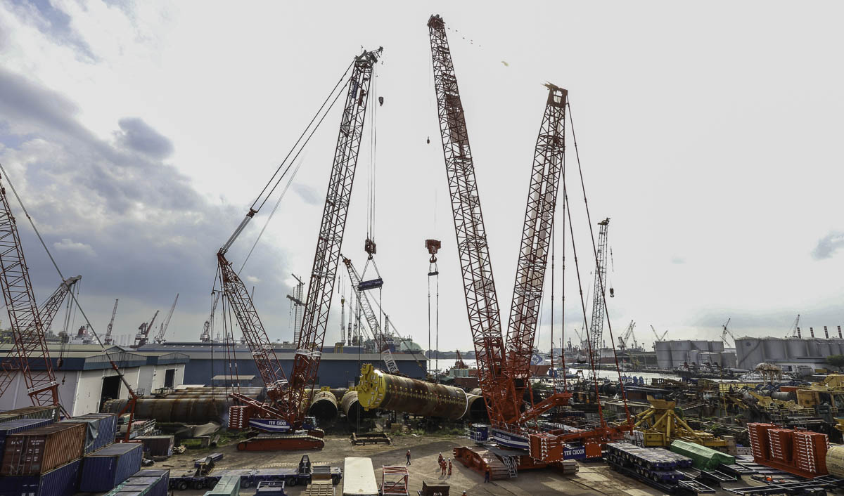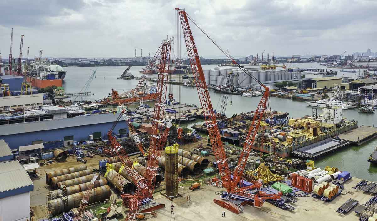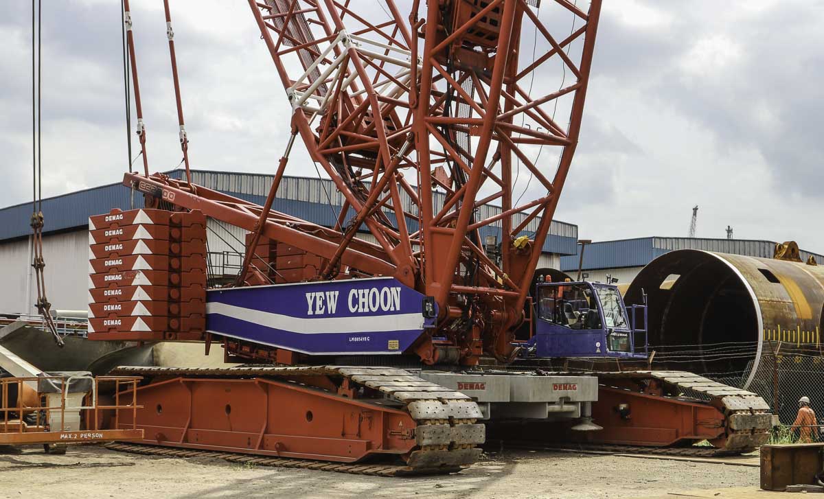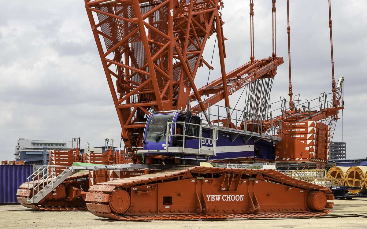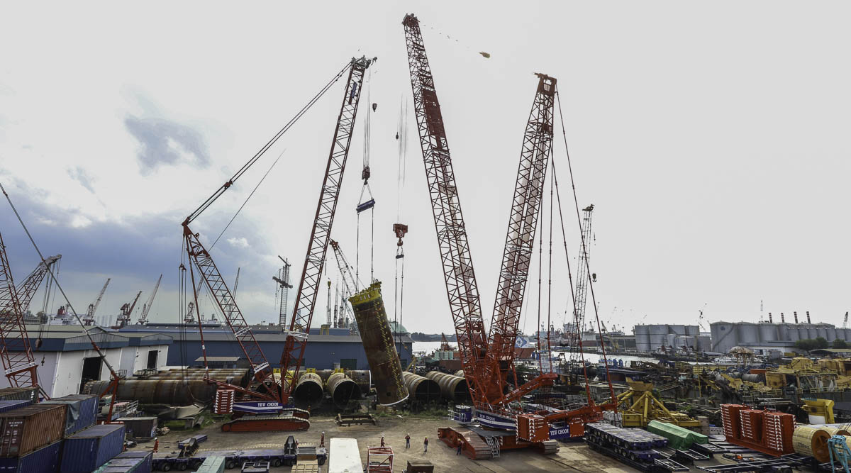 To tilt a heavy pile on the yard of Yew Choon in Singapore (SG) would both of their large crawler crane come to action. These are the Liebherr LR 1750/2 and Demag CC 2800. That sound like some impressive lifting.