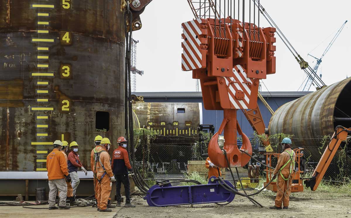 Once the IHI is secured to the load, the pile can be pulled out from underneath.