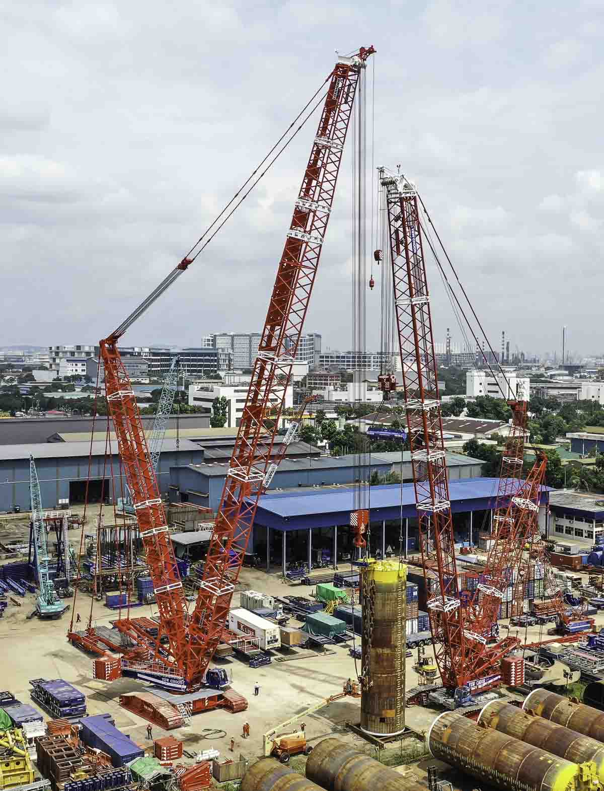 The Demag CC 2800 is set up in superlift configuration with a 60-meter-long main boom. The IHI CCH1500-2 is working with a 27-meter-long main boom.