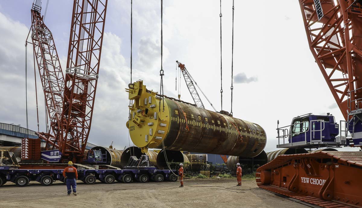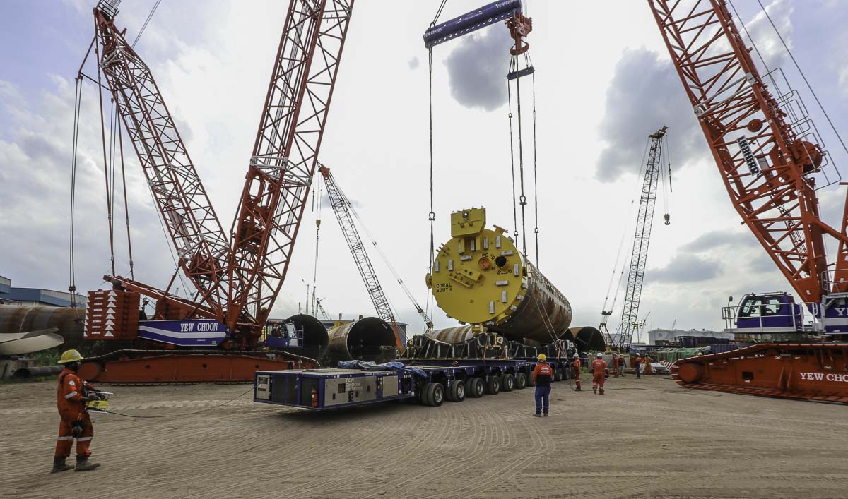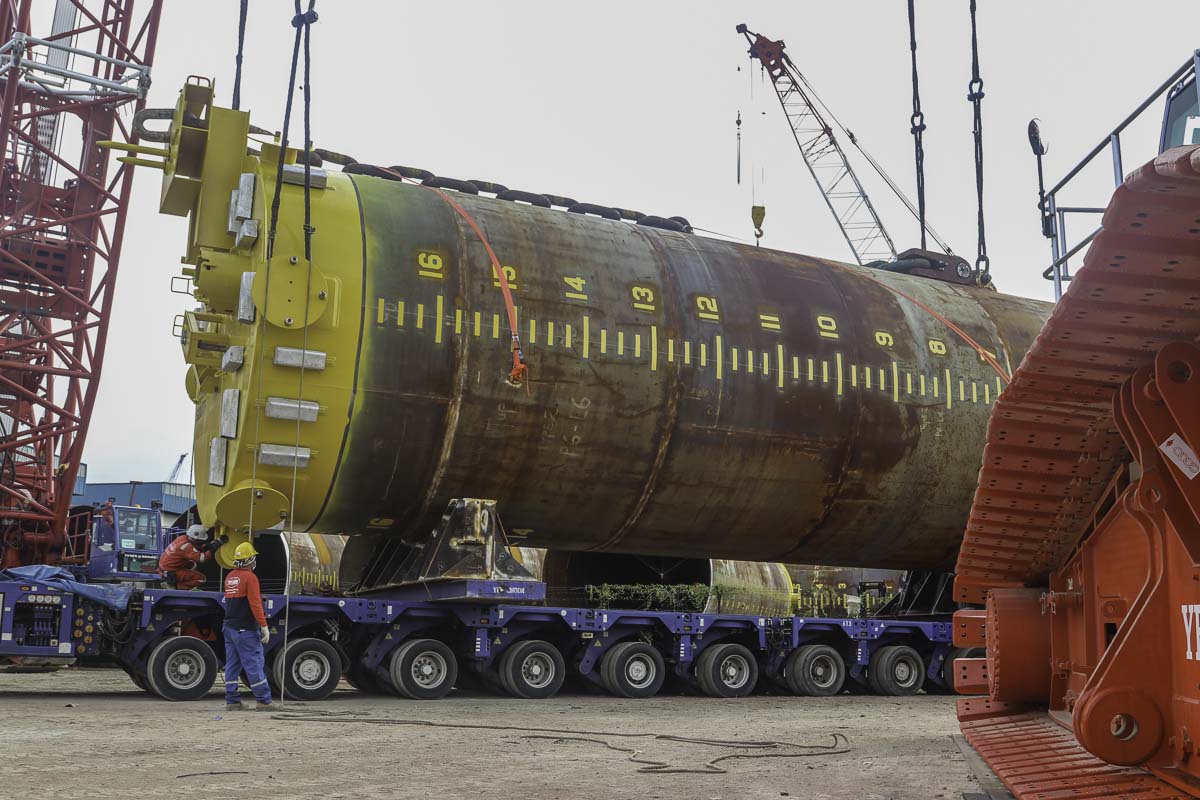 The slings are attached to the hook. The lifting will be started soon. The 600-tonne hook weights around 16 tonnes.