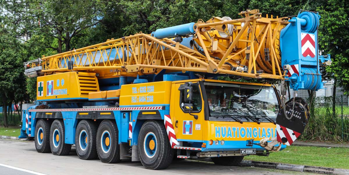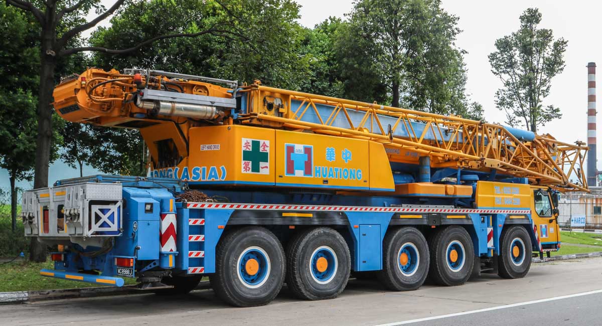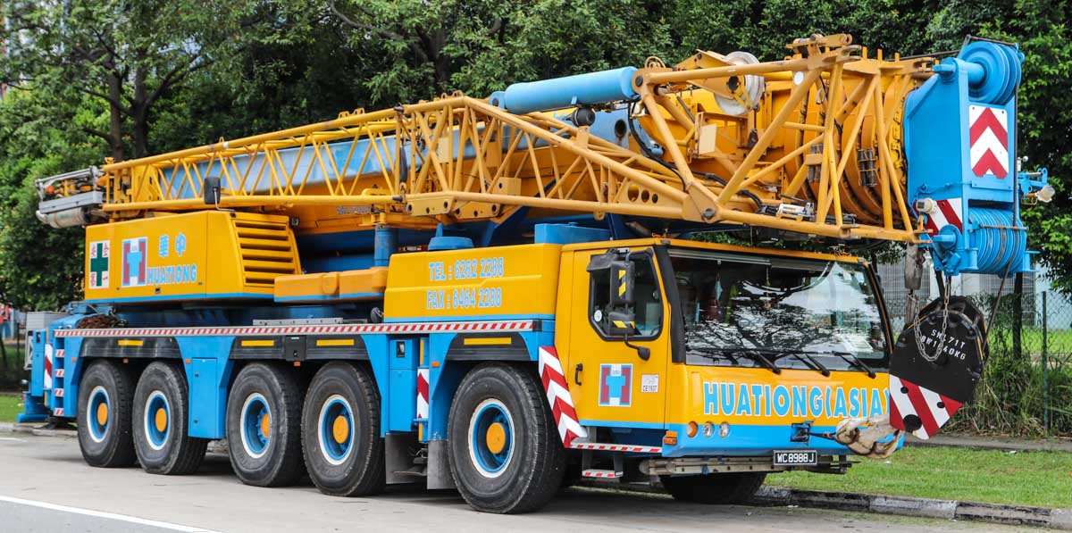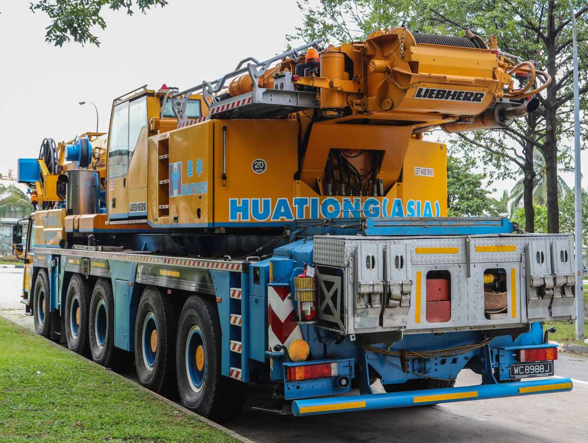 This fine Liebherr LTM 1200-5.1 belongs to Huationg (Asia) from Singapore (SG). It is a 200-tonne telescopic crane mounted on a 5-axle carrier, built in 2009.