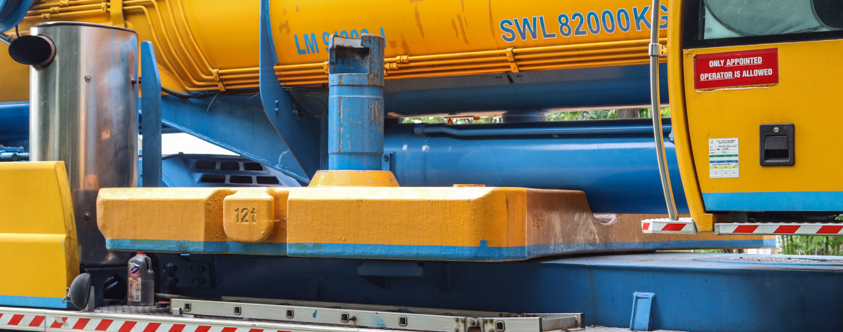 The 12-tonne base plate is carried on the deck of the carrier. This is the only counterweight the crane can transport itself; the remaining six slabs, each weighing 10 tonnes, must be delivered by truck.