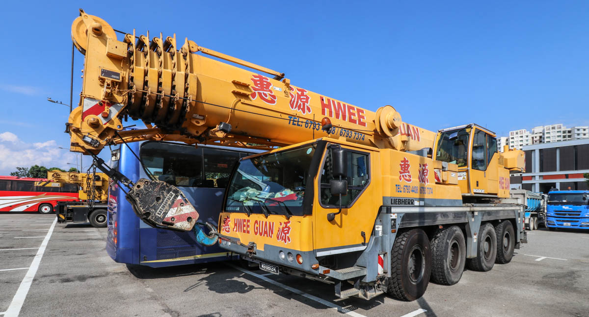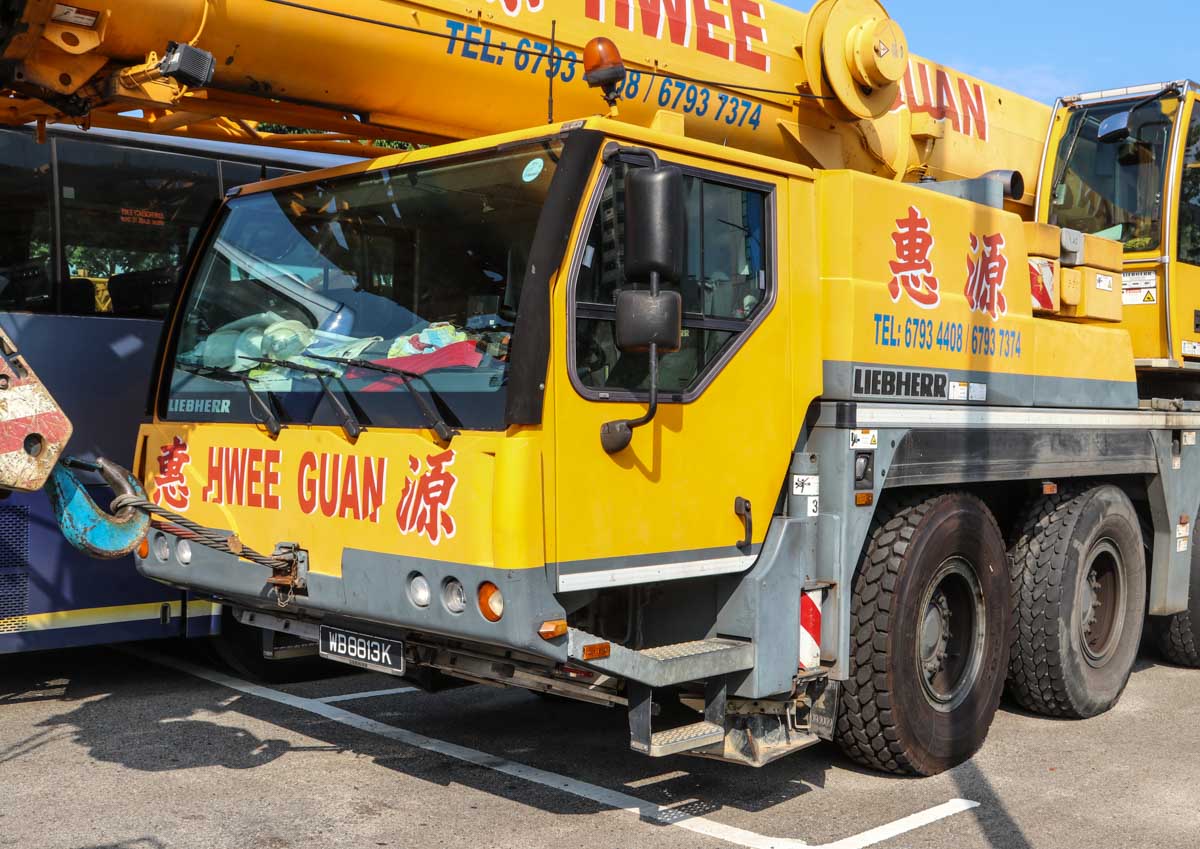 This Liebherr LTM 1070-4.2 from model year 2013 is operated by Hwee Guan from Singapore (SG). It is a 70-ton crane mounted on a 4-axle carrier.