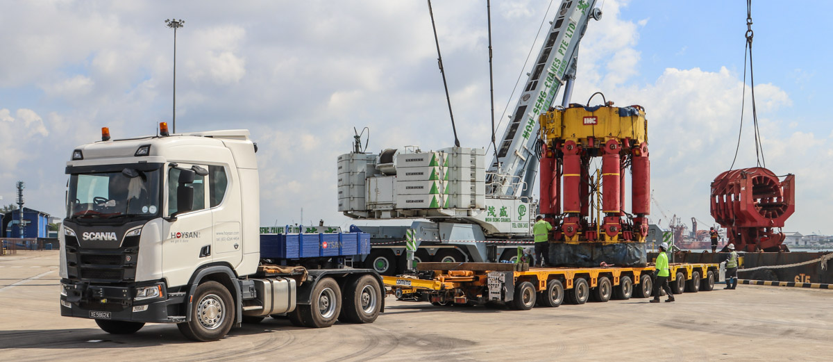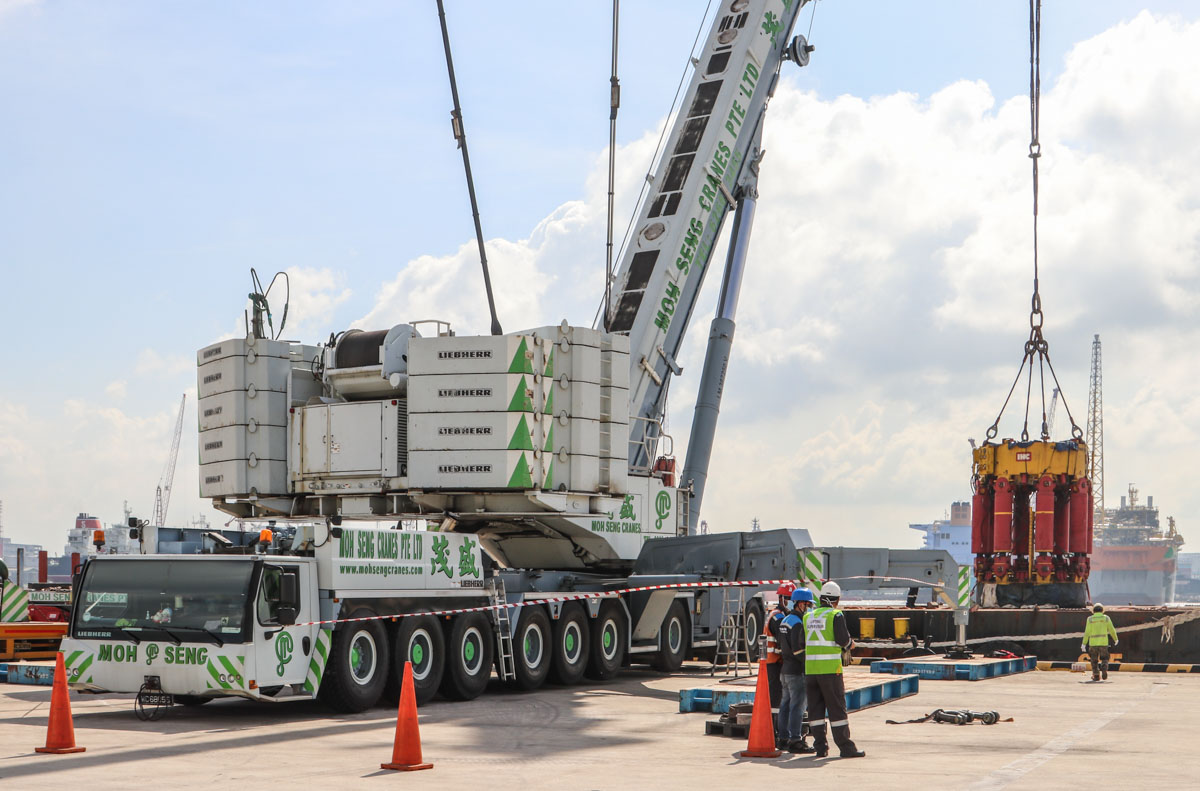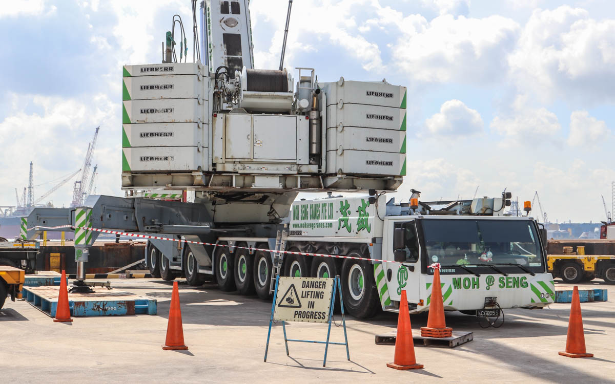 Here, the impressive Liebherr LTM 1750-9.1 of Moh Seng from Singapore (SG) was deployed on behalf of Bok Seng to lift two heavy components from a pontoon and load them onto transport combinations.