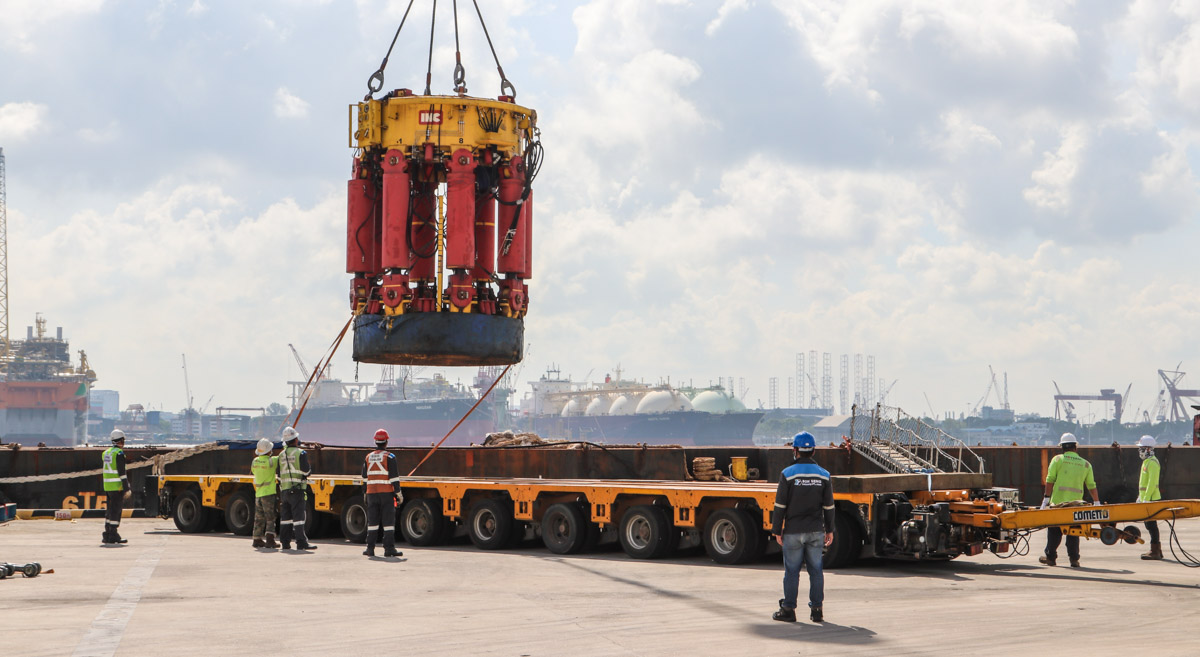 The load, a component used in offshore piling operations, will be loaded onto a waiting 10-axle Cometto platform trailer.