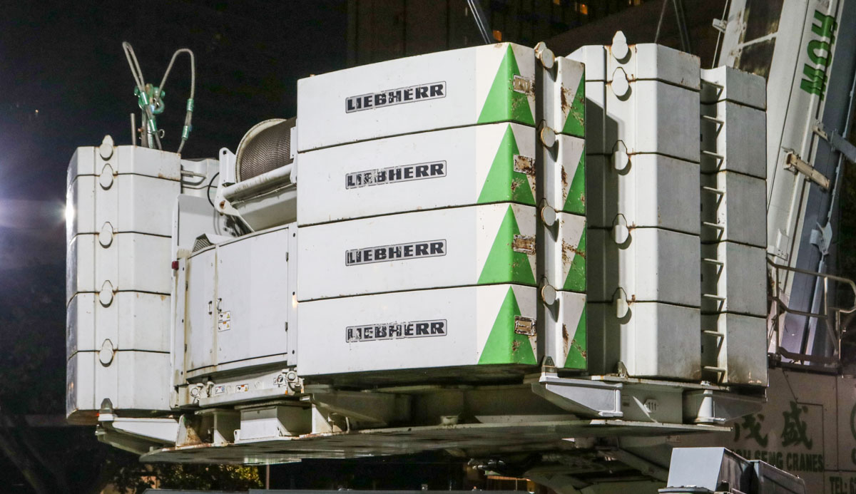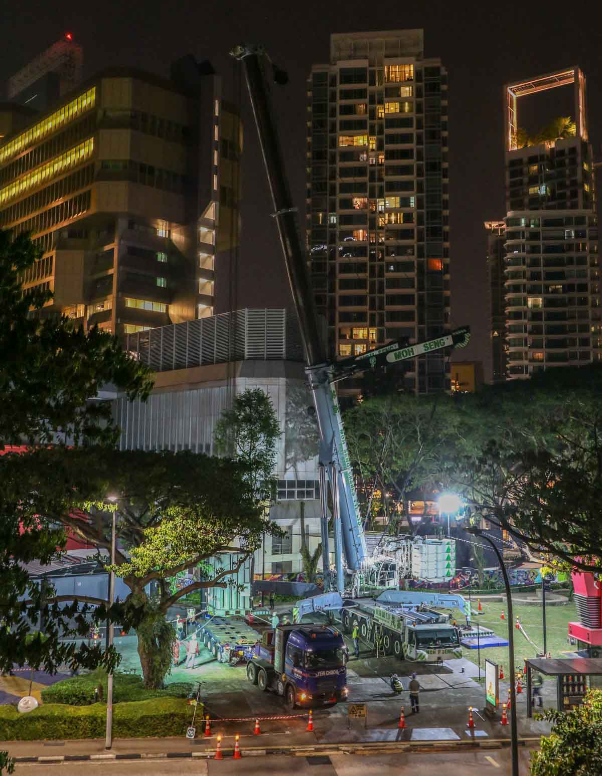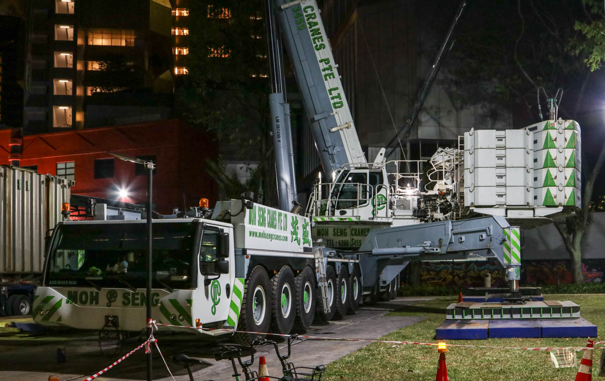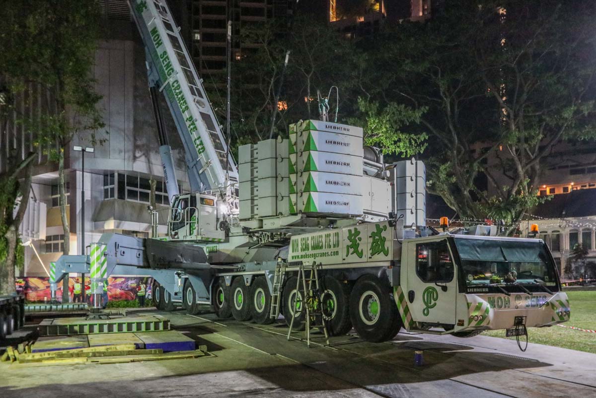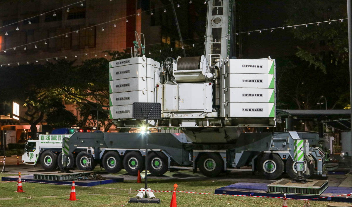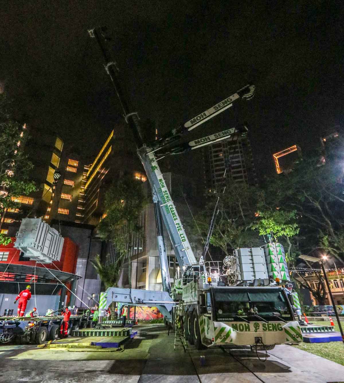 Here, the fine Liebherr LTM 1750-9.1 of Moh Seng from Singapore (SG) was deployed to lift two heavy transformers. This operation took place in the city center near the well-known Orchard Road.