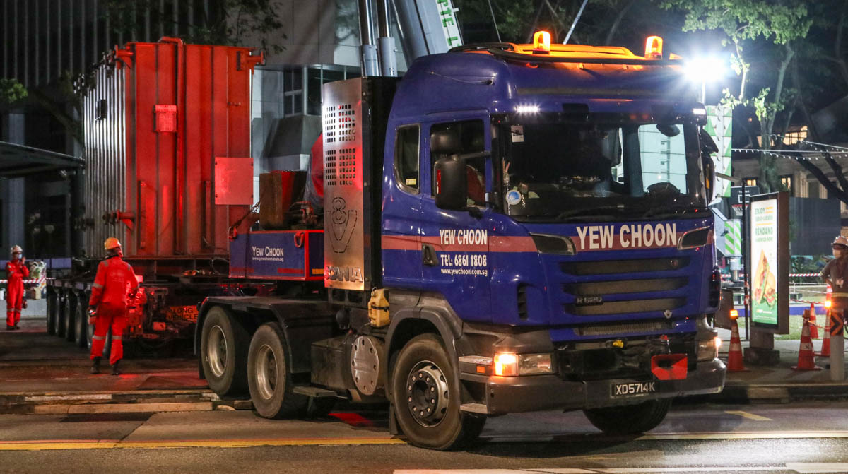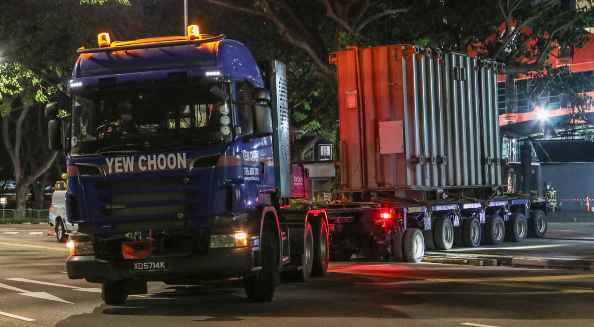 The old one out – and the new one in. The other Scania R 620 of Yew Choon delivers the new transformer using the same type of combination.