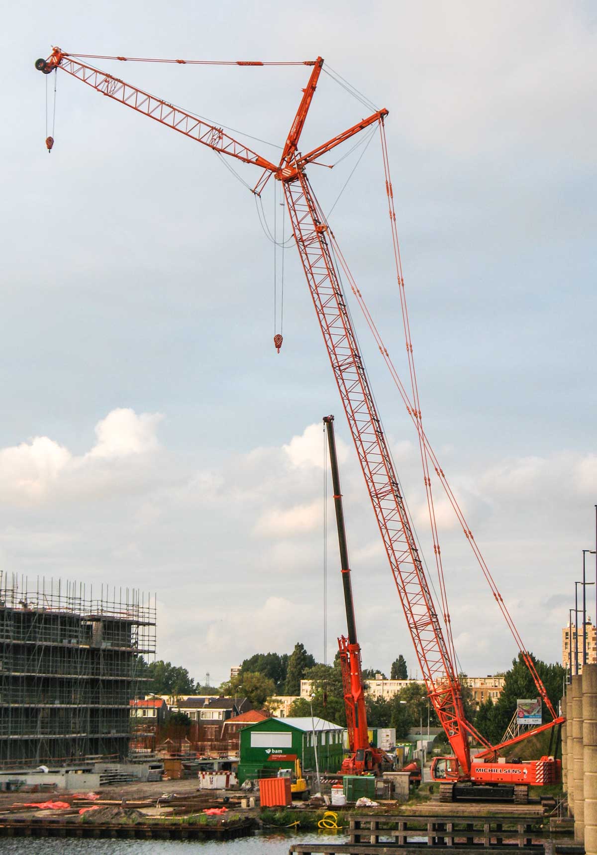 Here, the crane was configured in SHWS configuration. The main boom has a length of 52.3 metres and the luffing jib is 24.3 metres long in this setup. In this configuration, the crane can lift a maximum of 24.9 tonnes at a radius of 14 metres or 17.3 tonnes up to a radius of 30 metres. A fine crane from Michielsens, a company that no longer exists today.