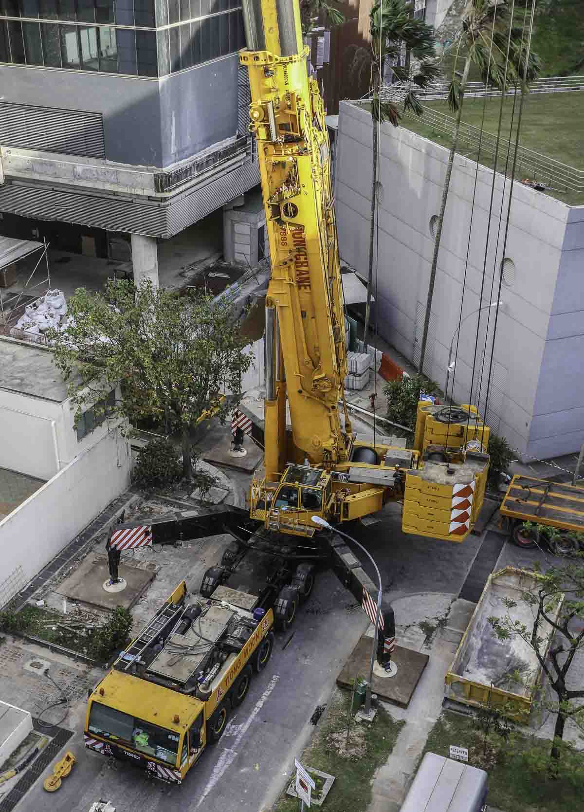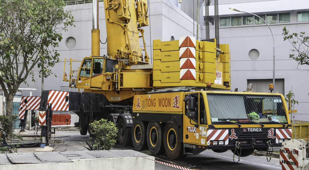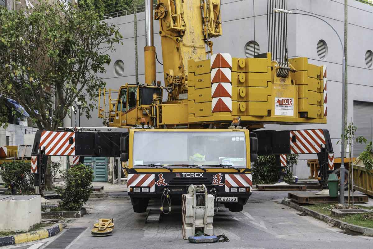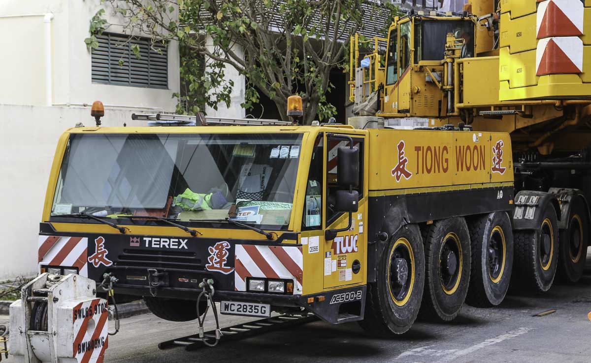 This very nice Terex AC 500-2 of Tiong Woon from Singapore (SG) was used on a Sunday to lift building materials onto the roof of a building. It is a 500-ton crane with an 8-axle undercarriage. Both Liebherr LTM 1500-8.1 belonging to Moh Seng were previously deployed on the same construction site too.