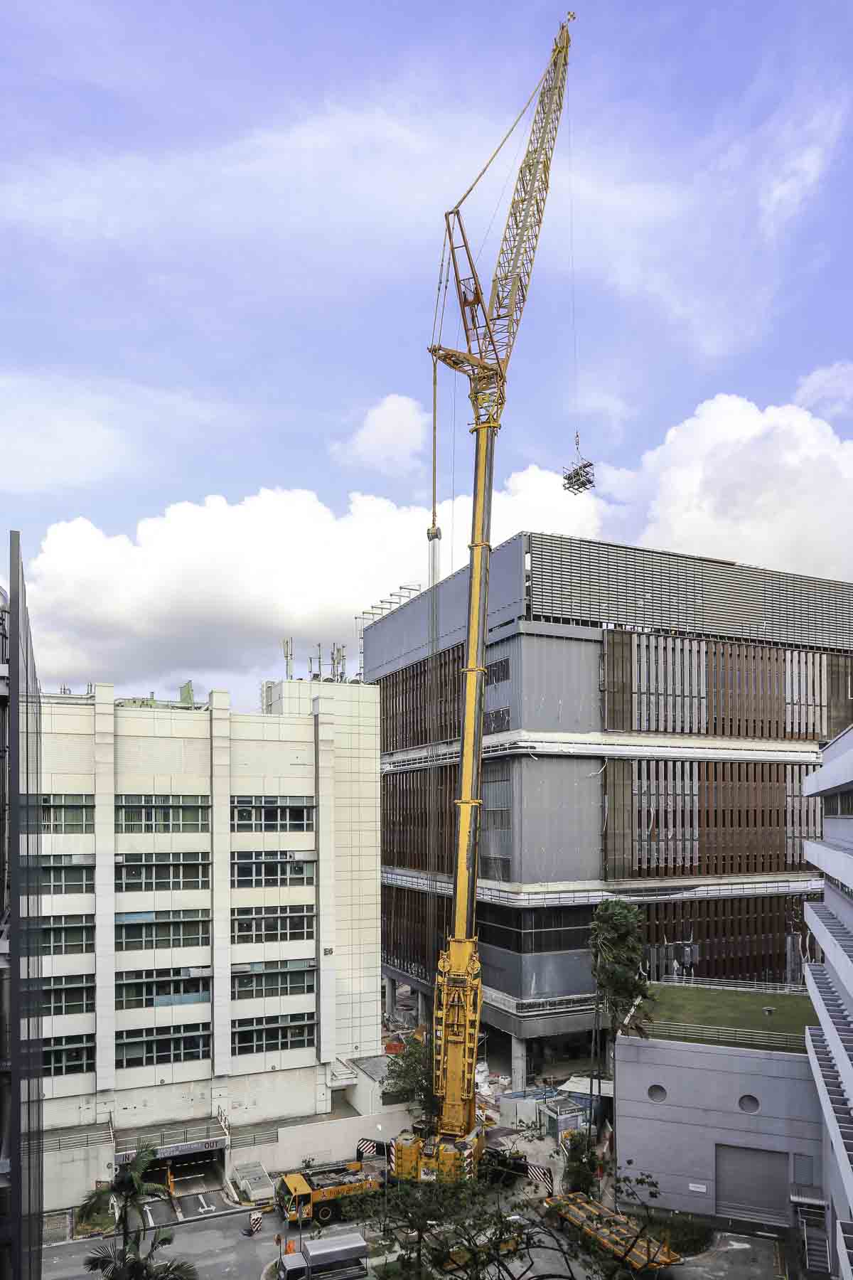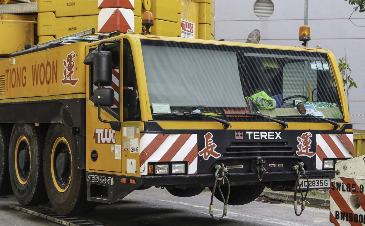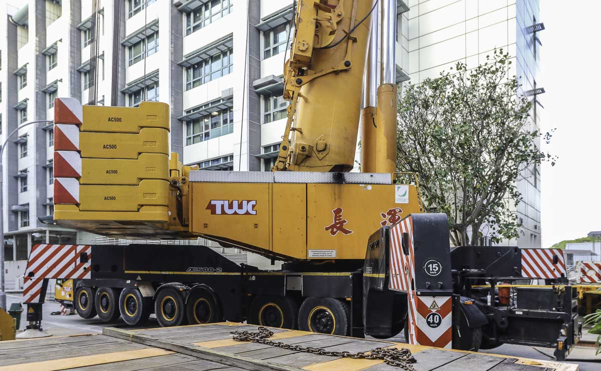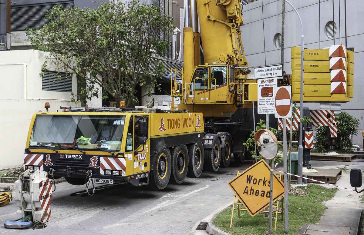 This very nice Terex AC 500-2 of Tiong Woon from Singapore (SG) was used on a Sunday to lift building materials onto the roof of a building. It is a 500-ton crane with an 8-axle undercarriage. Both Liebherr LTM 1500-8.1 belonging to Moh Seng were previously deployed on the same construction site too.