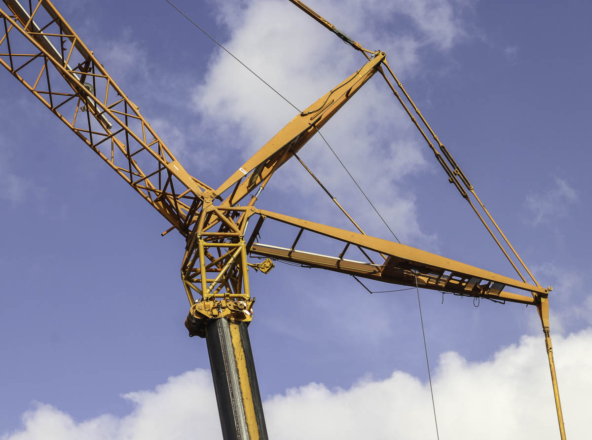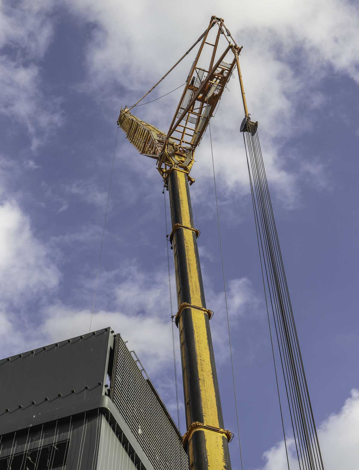 Here, the crane was equipped with a luffing jib. The luffing jib has a base length of 24 meters and can be extended in 6-meter increments up to a maximum of 90 meters. The main boom has a base length of 14.7 meters and extends four times to a maximum length of 56 meters.