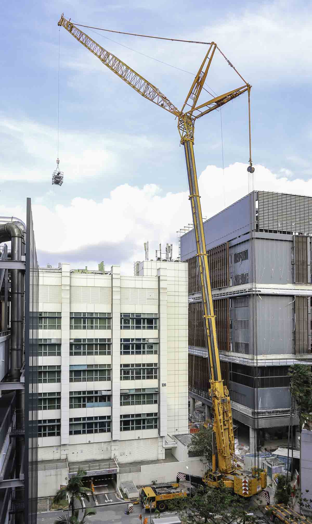 Here, the main boom was extended to a length of 51.8 meters, and the luffing jib has a length of 60 meters.