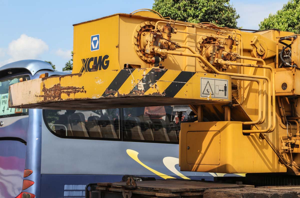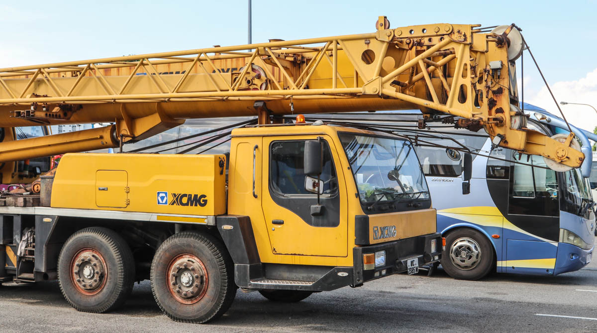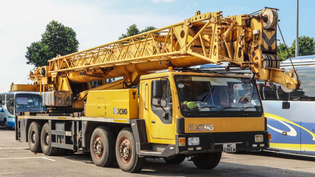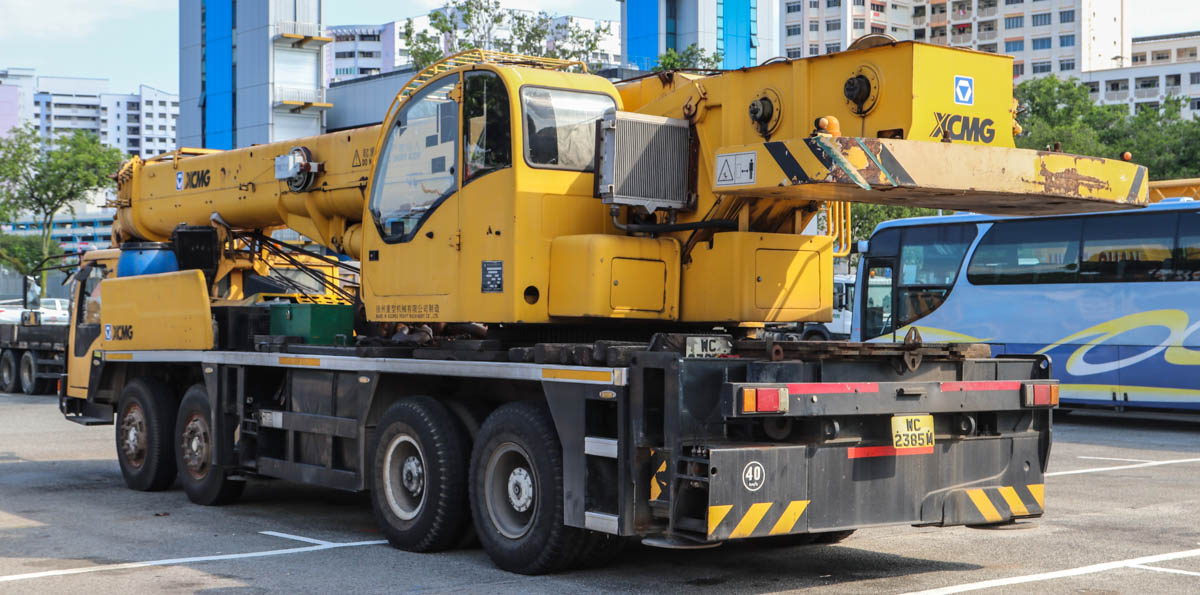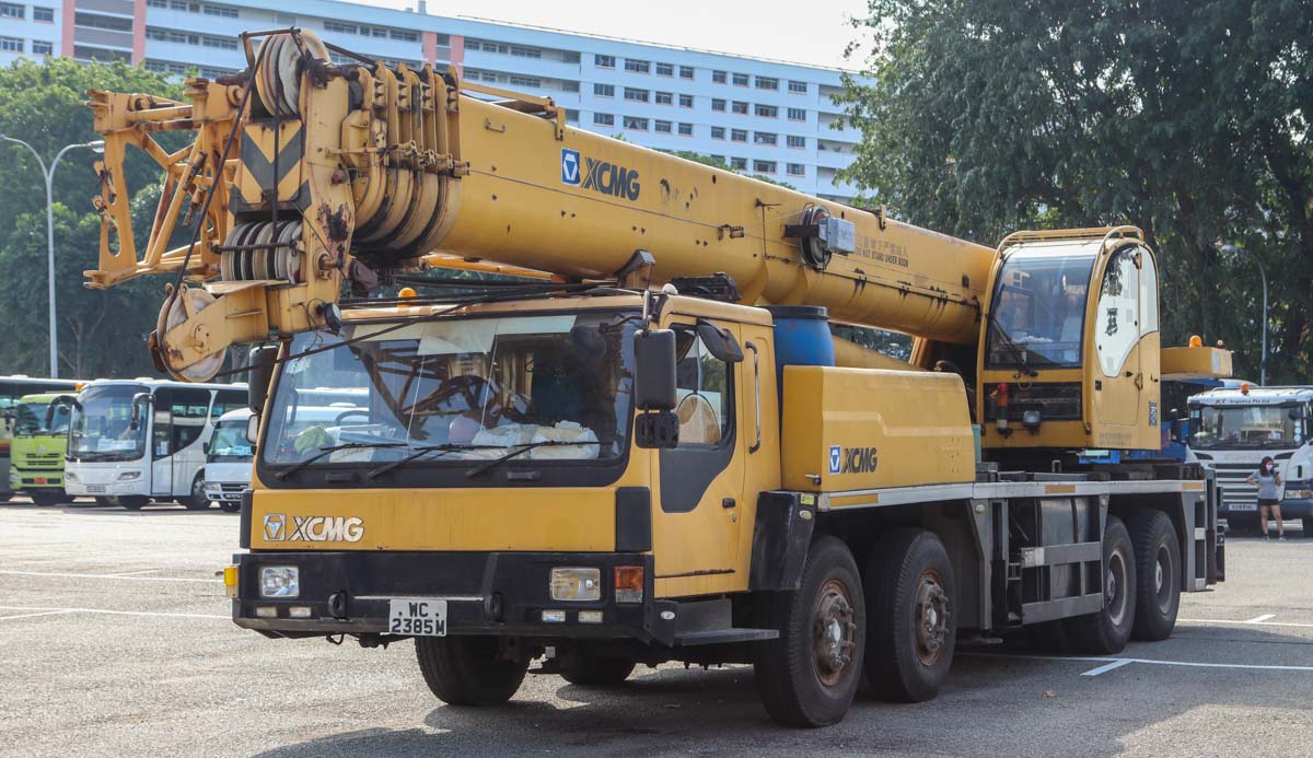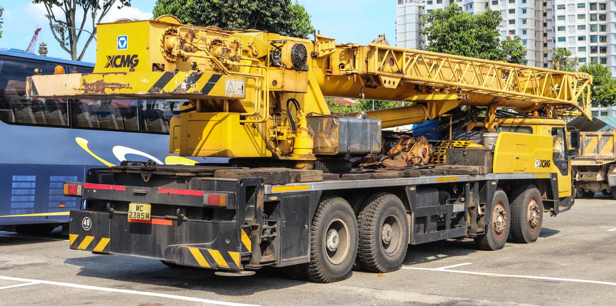 This XCMG QY50K of an unknown owner was parked on a large-vehicle parking area in Singapore (SG). It is a 50-ton crane mounted on a 4-axle carrier from model year 2008.