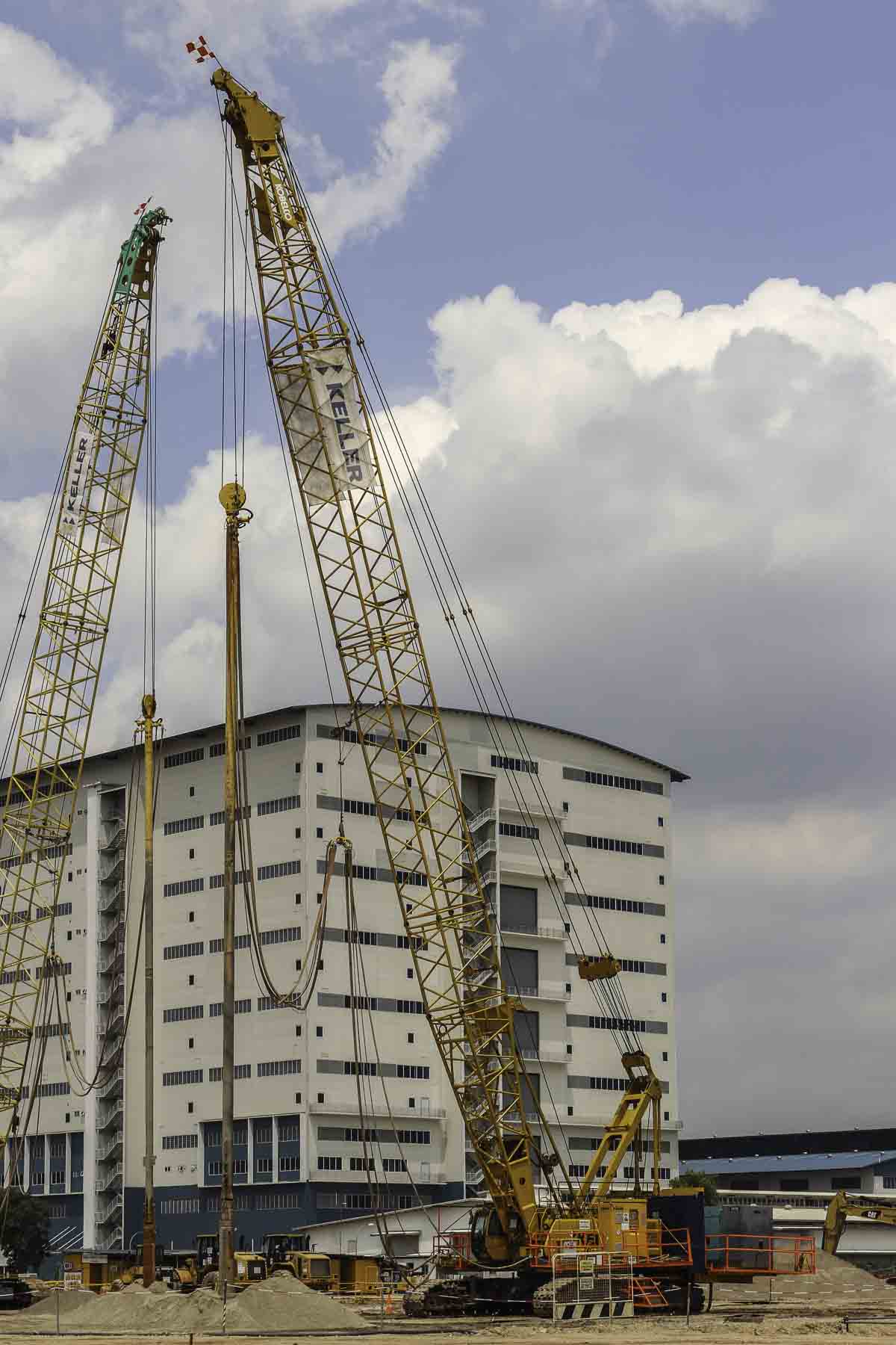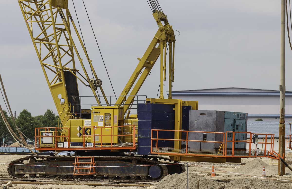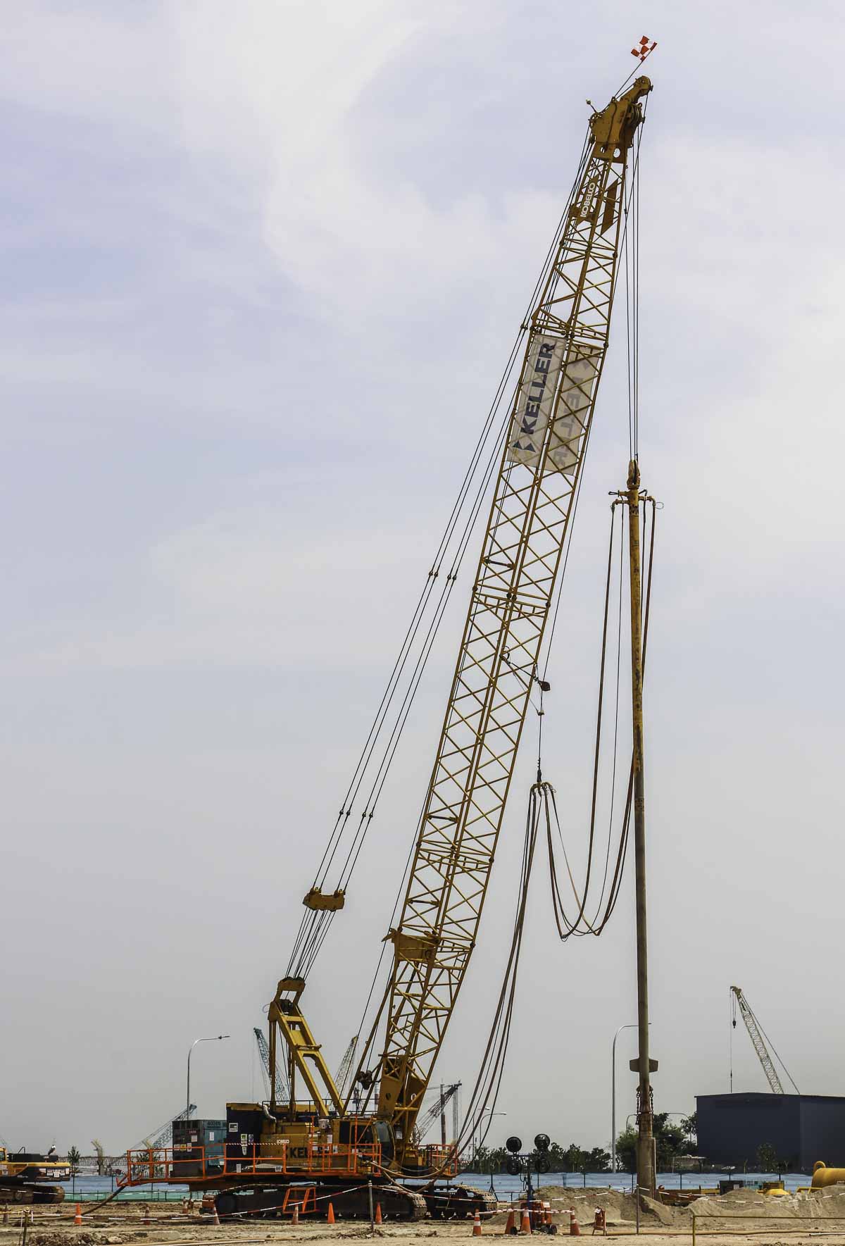 This sharp Kobelco 7120S of Keller from Singapore (SG) was used on a construction site in Singapore for vibro compaction for a new refinery. It is a 120-tonne crawler crane.