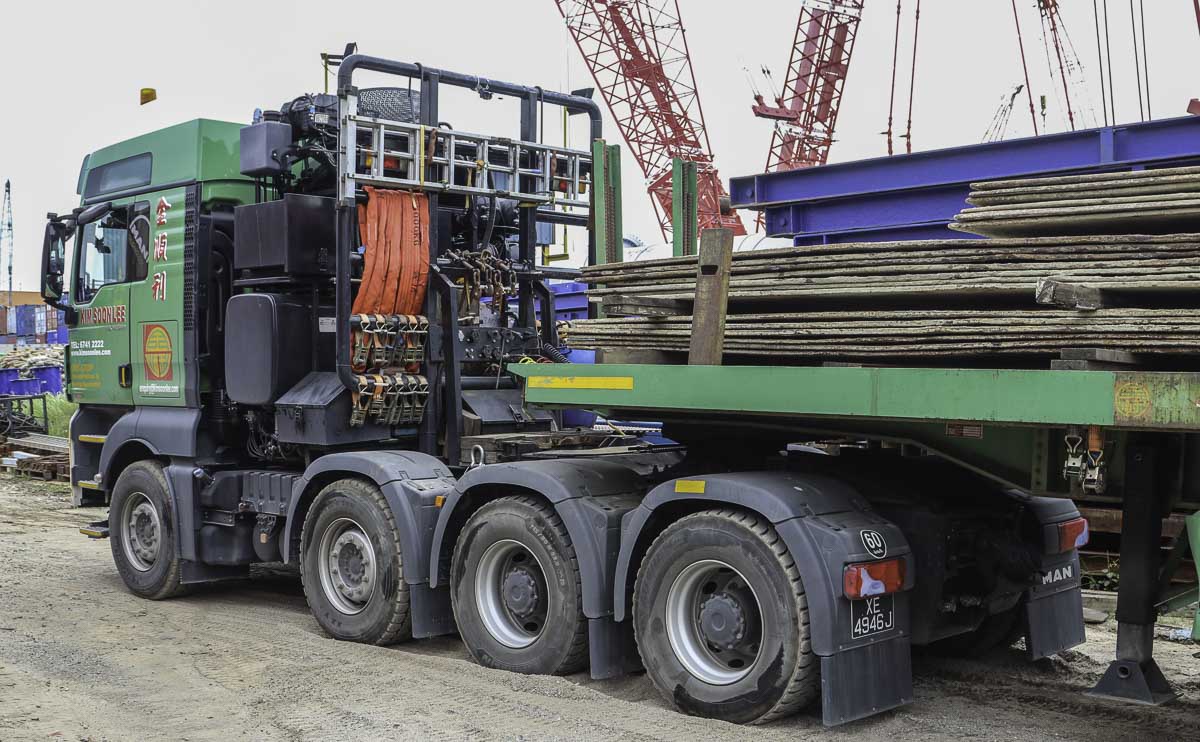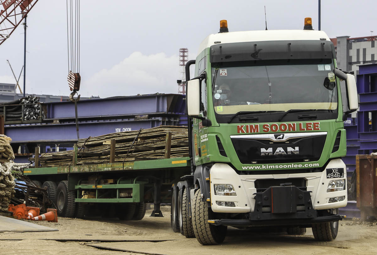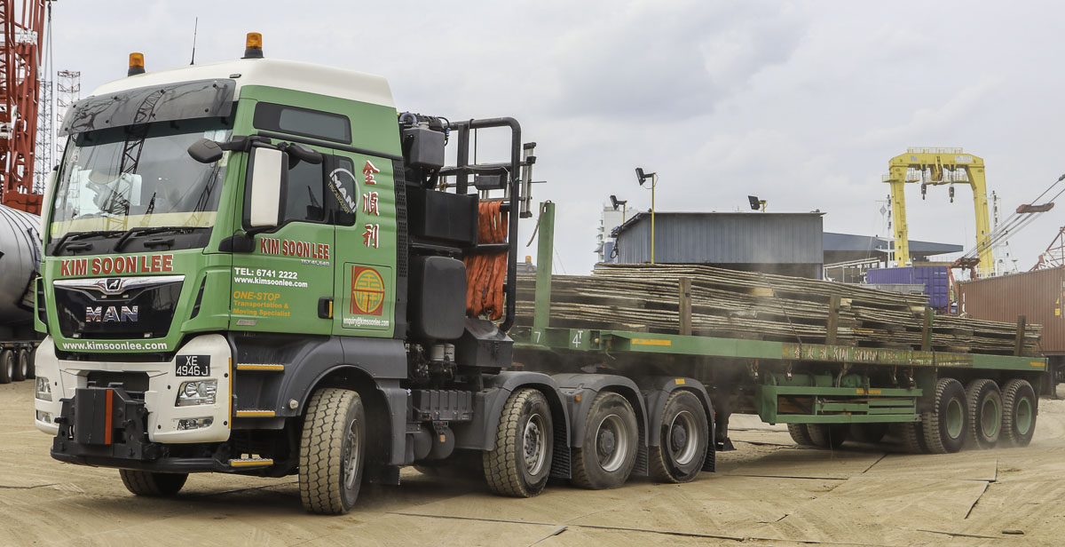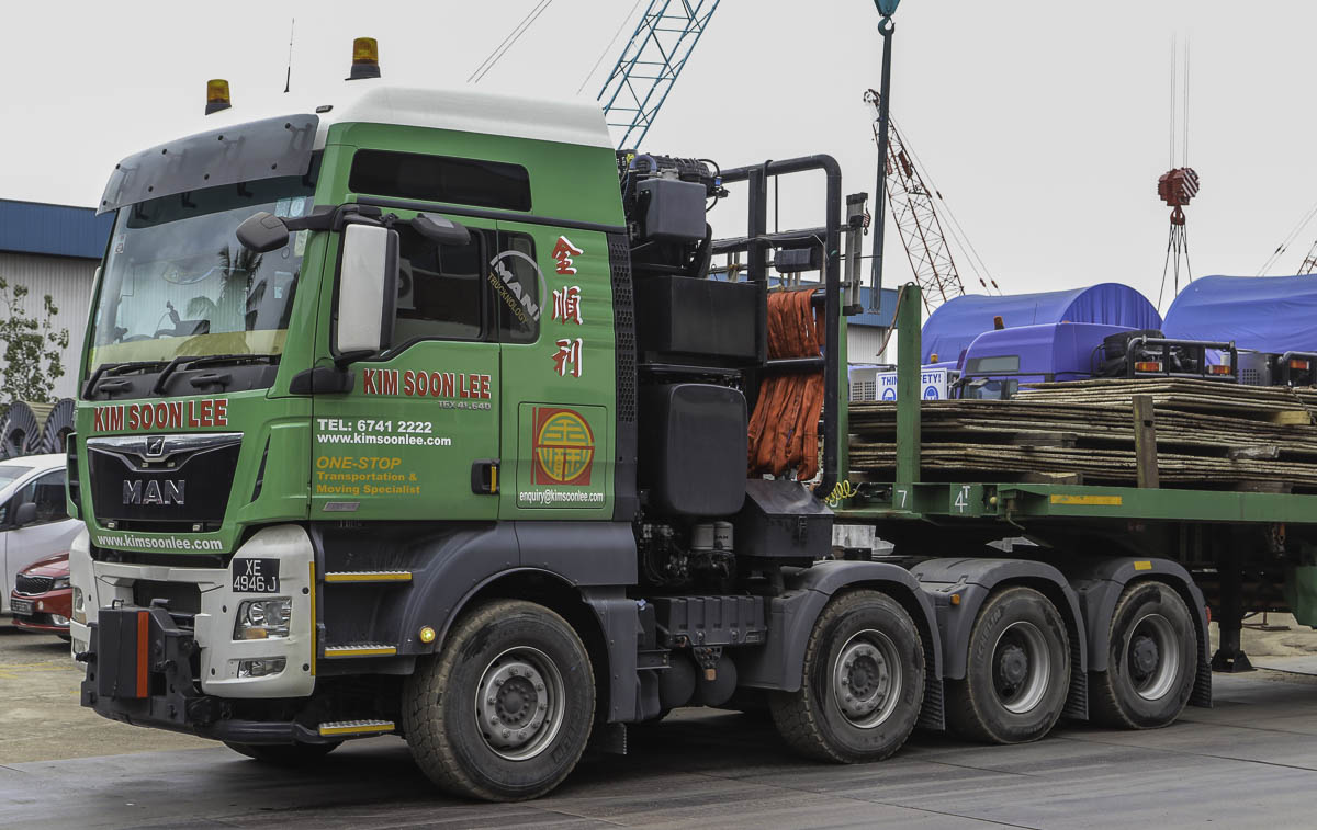 The heaviest and strongest truck that Kim Soon Lee from Singapore (SG) deploys ist his sharp MAN TGX 41.640. Here was the truck used to transport an hydraulic hammer from the port to the storage yard.
