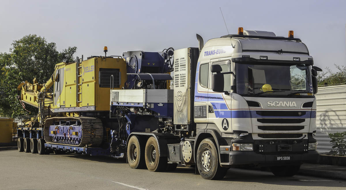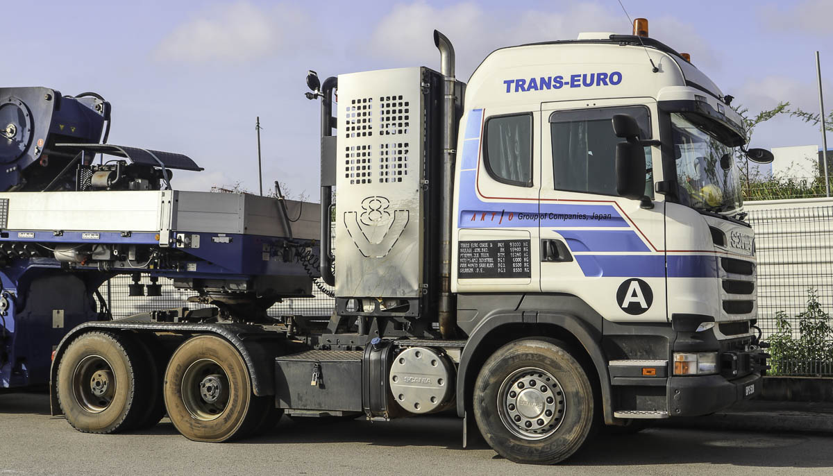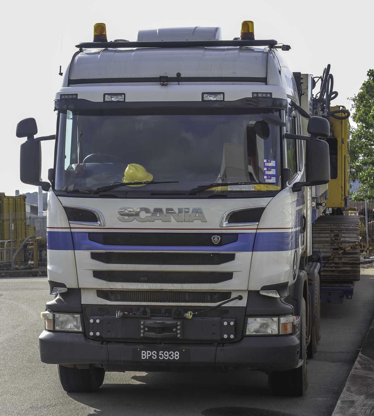 This sharp Scania R 730 belongs to Trans-Euro from Sham Alam (MY) and came to Singapore (SG) to deliver a base machine of a large drilling rig. The combination exists out of a 3-axle truck with a 4-axle low loader.