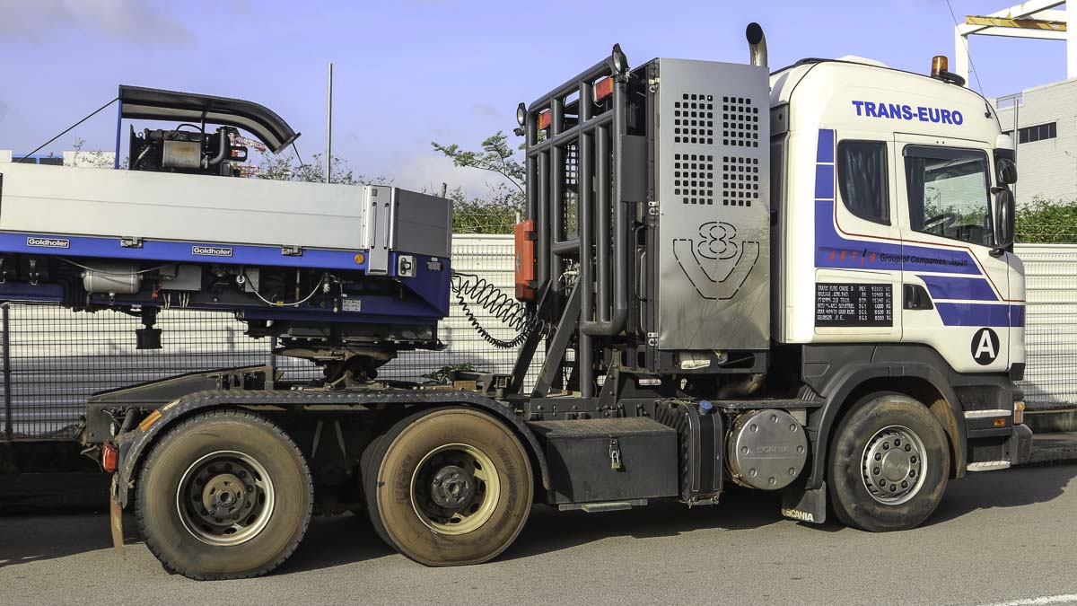 Here was a 4-axle Goldhofer low loader attached. The trailer is modulair and is composed out of a goosenack, a 160-tonne bridge and a 4-axle module.
