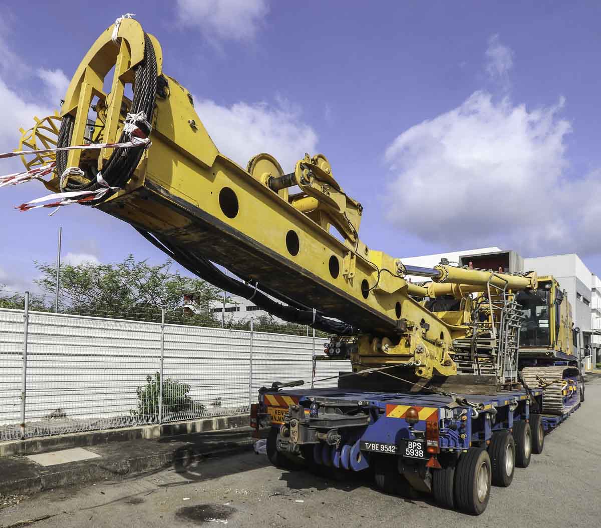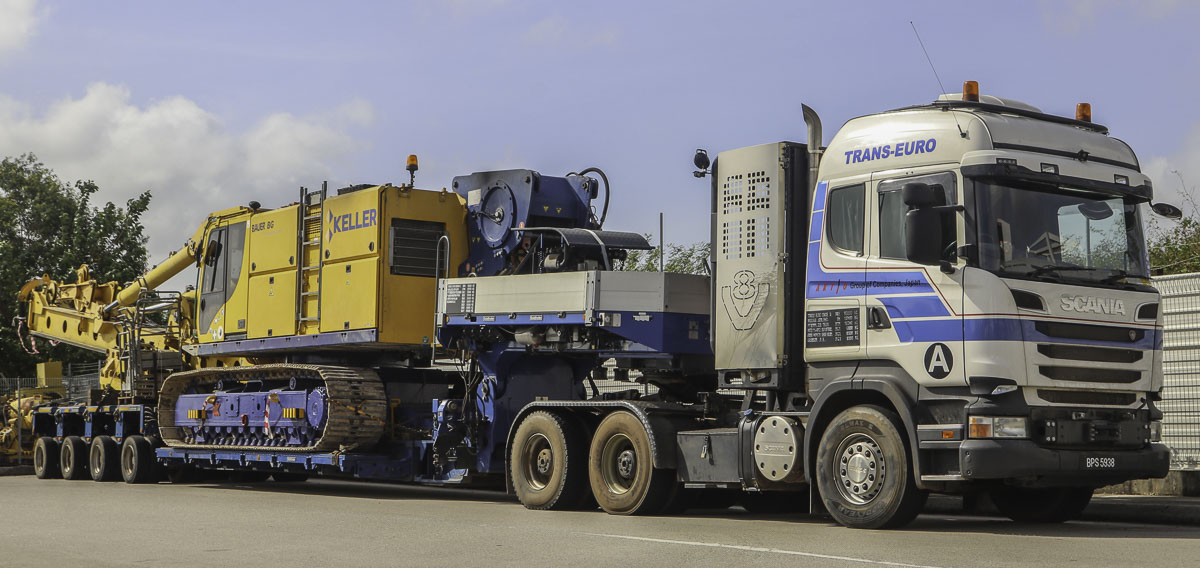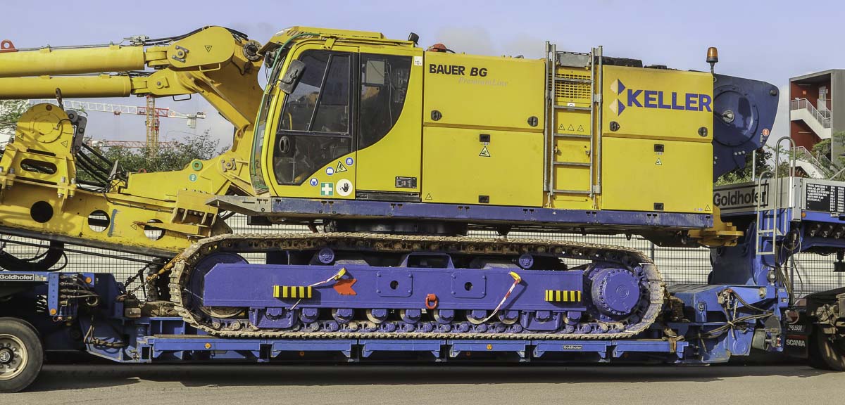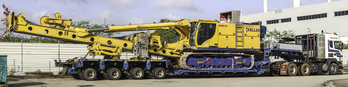 The cargo is the base machine of a Bauer BG 30 drilling rig. The machine is about 17 meters long, 3.27 meters wide and 3.5 meters tall. The transport mass is approx. 58 tonnes. The rig is loaded onto the side extensions, because the bridge with a height of 50 cm, is to tall for the free space (34 cm) below the base machine.