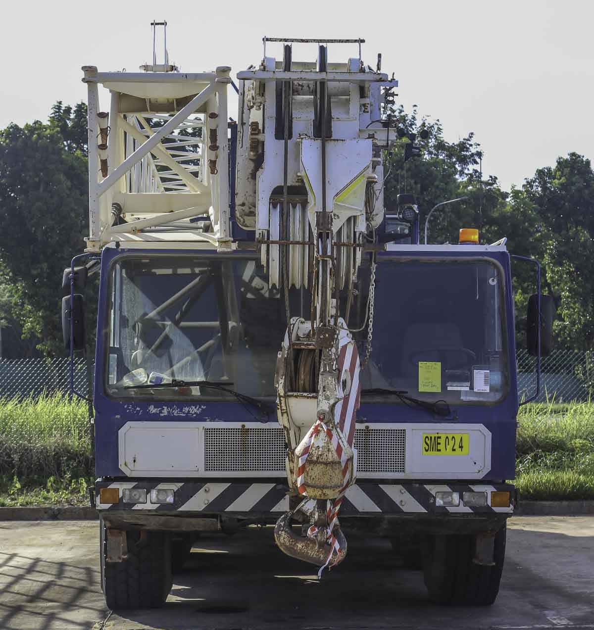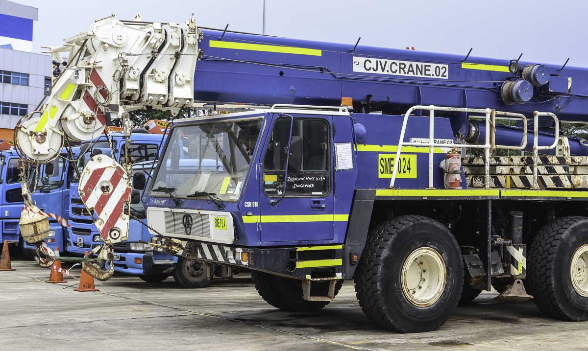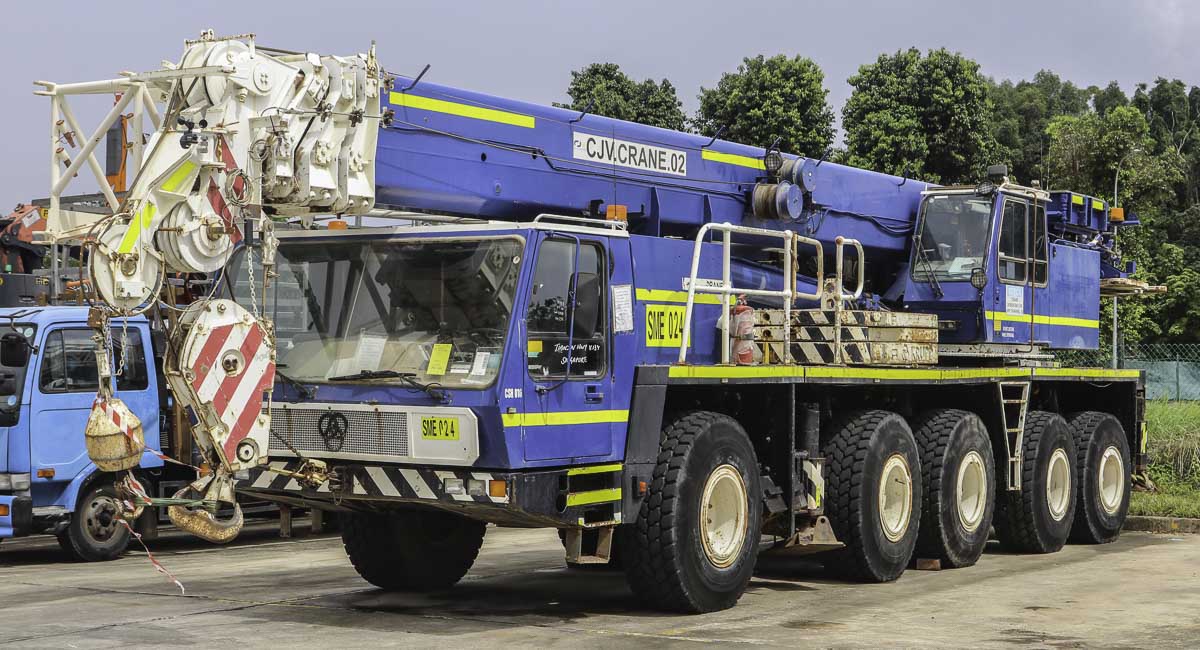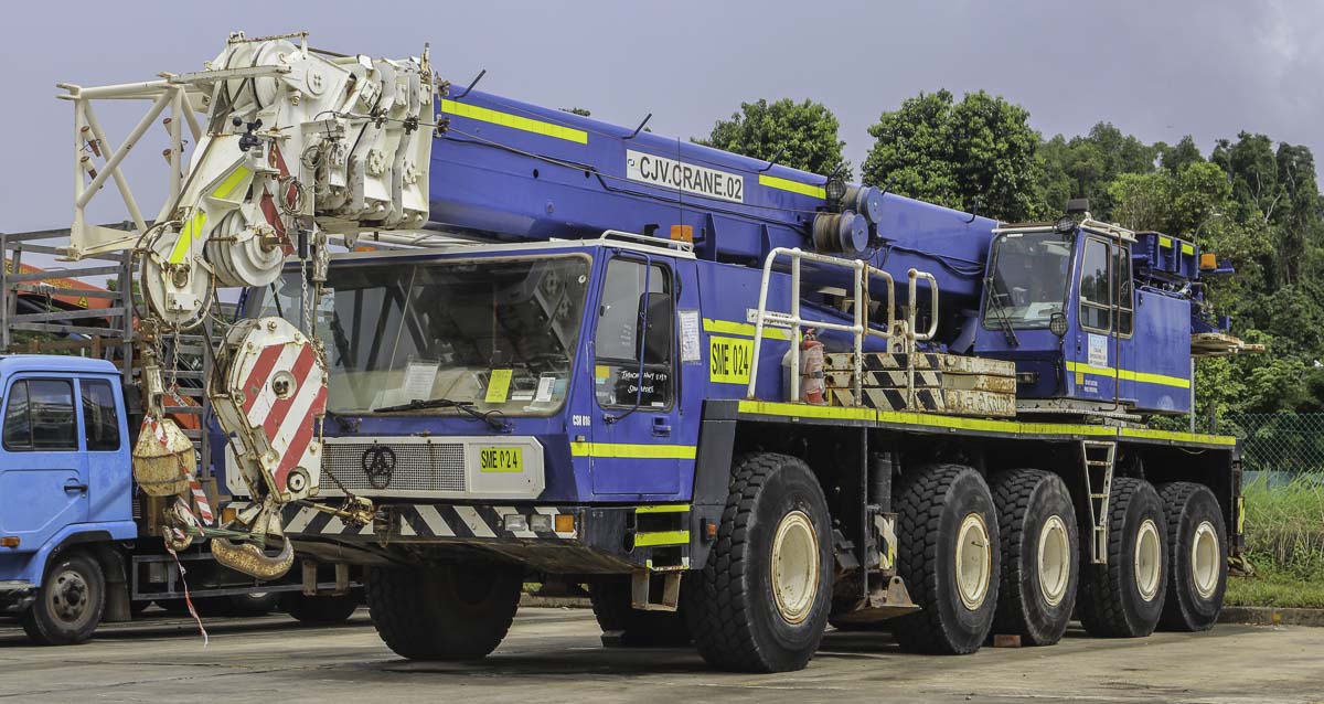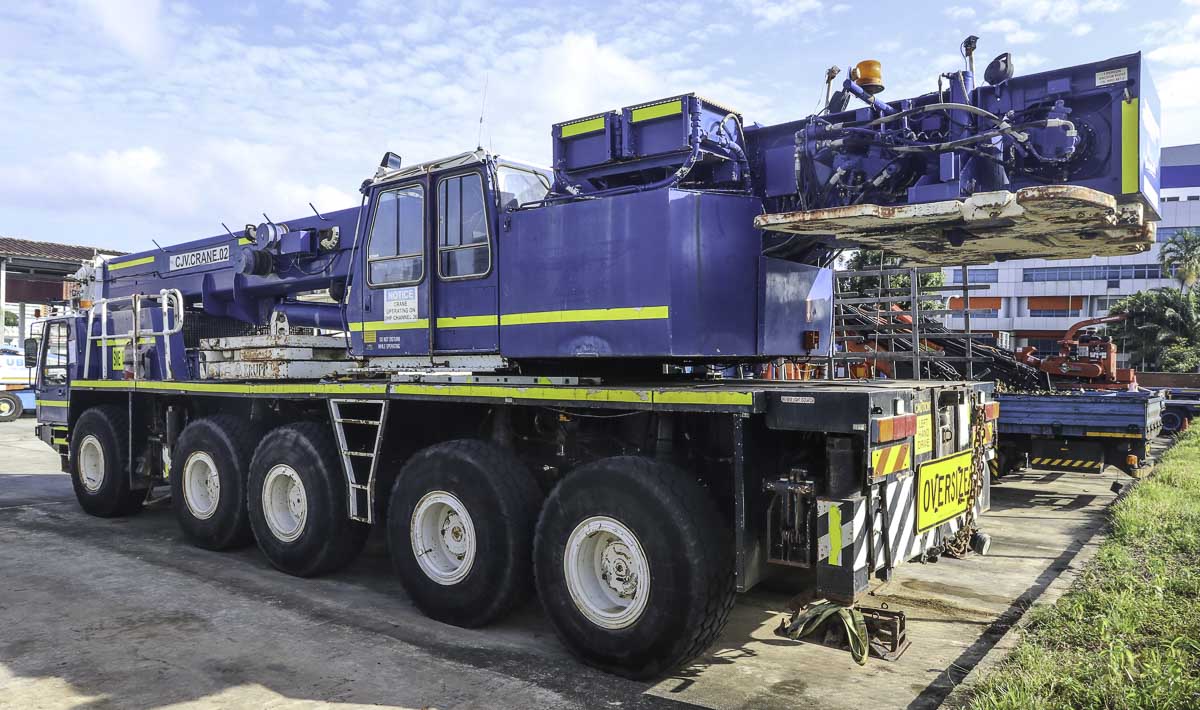 Deze interessante en zeer fraaie Krupp KMK5090 werd door CJV (Challenger Joint Venture) in een goudmijn in Australie ingezet. Hier stond de kraan in Singapore (SG) geparkeerd en zou spoedig naar een ander land geexporteerd worden. Het is een 90-tons kraan gemonteerd op een 5-assige onderwagen uit het bouwjaar 1991.